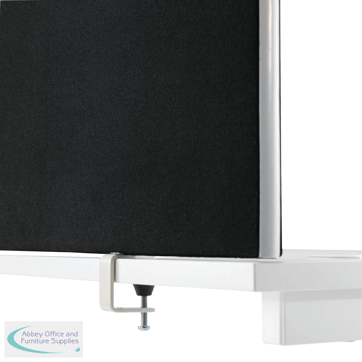 Provide privacy and reduce noise levels between desks with this Jemini Mounted Desk Screen. This screen is designed to be durable and economic. The screen is upholstered with Elfin flame retardant fabric with a protective up VA edge trim. This screen measures 1200x25x400mm in size and comes with a pair of standard desk clamps.