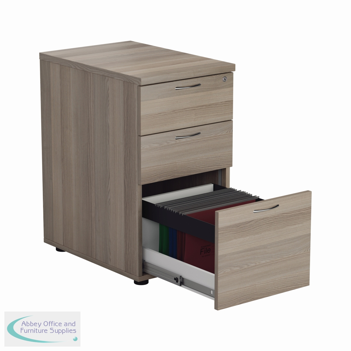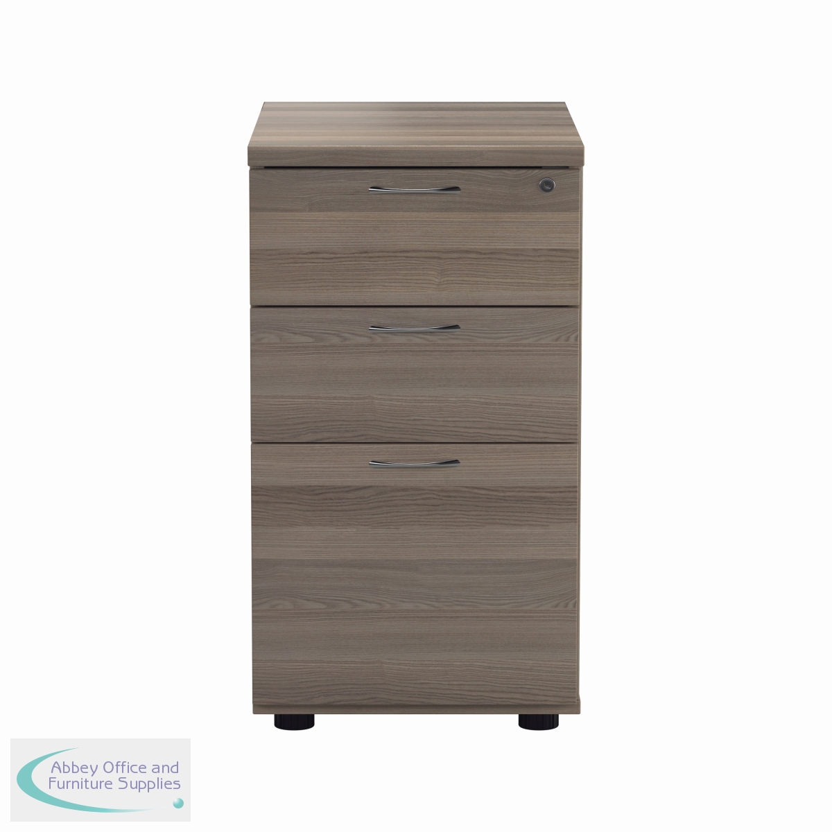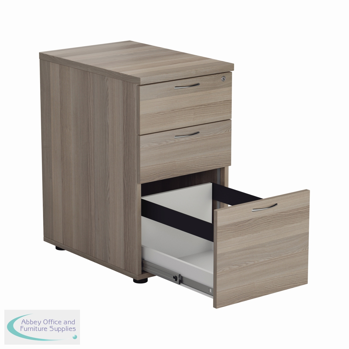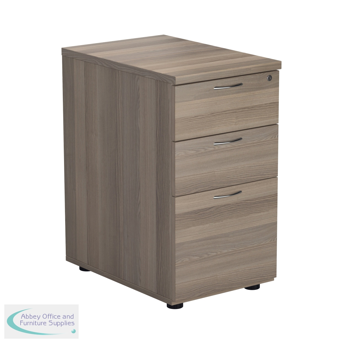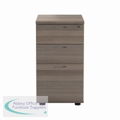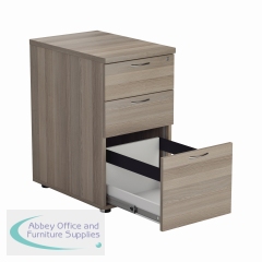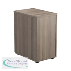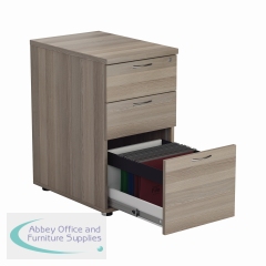 Offering a convenient and flexible place to store documents, papers and stationery, this grey oak-finish desk high pedestal can fit conveniently next to your desk to provide additional work space. The pedestal features 2 box drawers and 1 filing drawer suitable for foolscap suspension filing. This pedestal measures W404xD600xH730mm and can be placed beside the 600mm end of a radial desk.