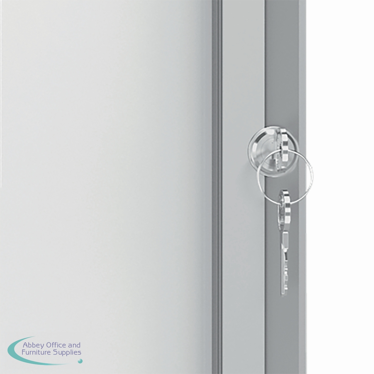 Magnetic outdoor weatherproof lockable notice board with a hinged glass door and side lock. Complete with a modern stylish aluminum trim and fixed with a through corner wall mounting. Excellent magnetic notice board surface to securely display your notices.