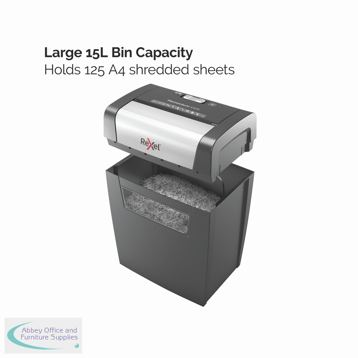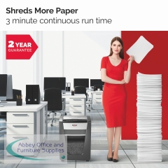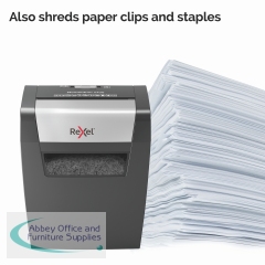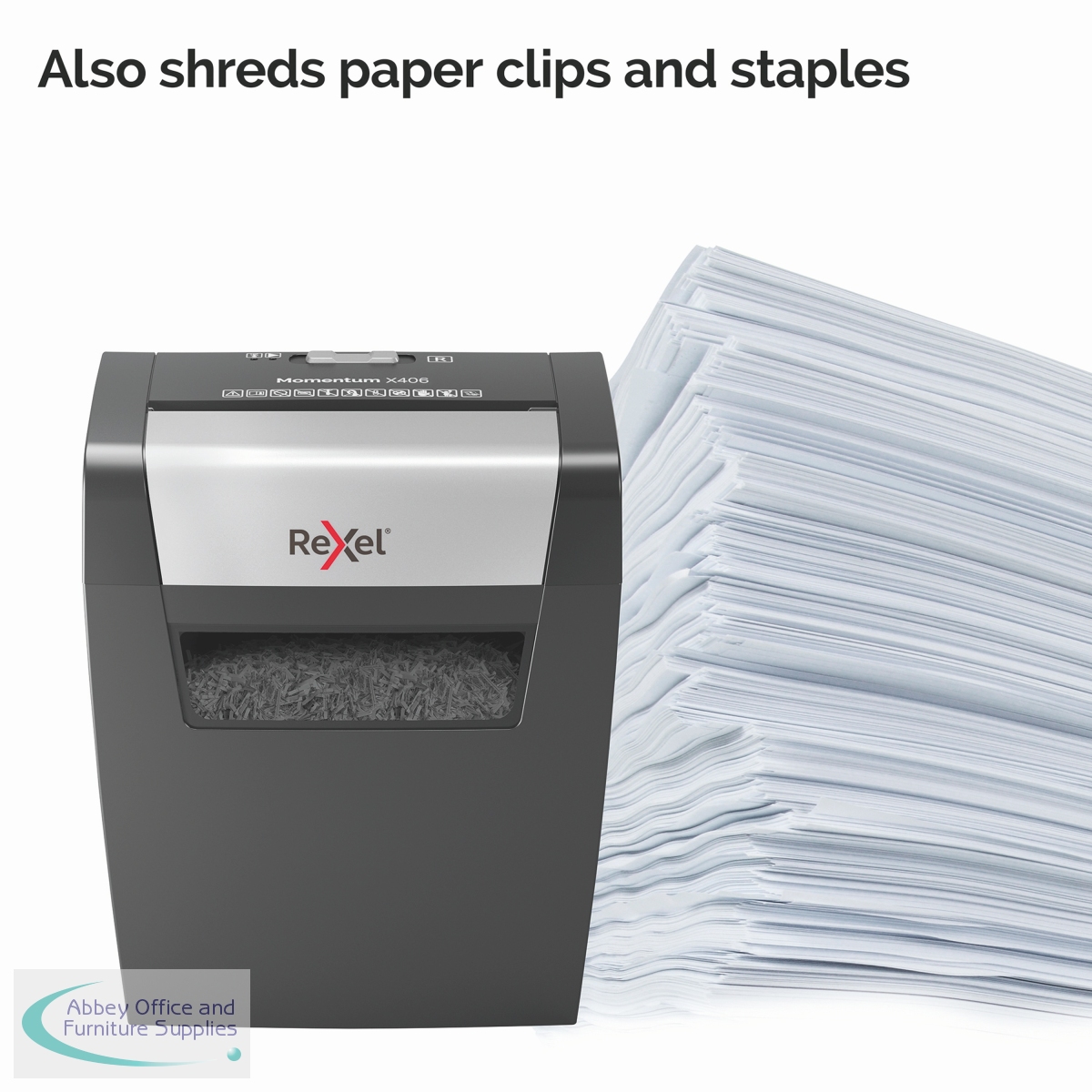 Rexel Momentum X406 Shredder easily shreds multiple documents, even with staples and paper clips attached at the corners. It can shred up to 6 pieces of paper in one go with a three-minute continuous run time and a generous 15-litre bin capacity that can hold up to 125 sheets of A4 paper.