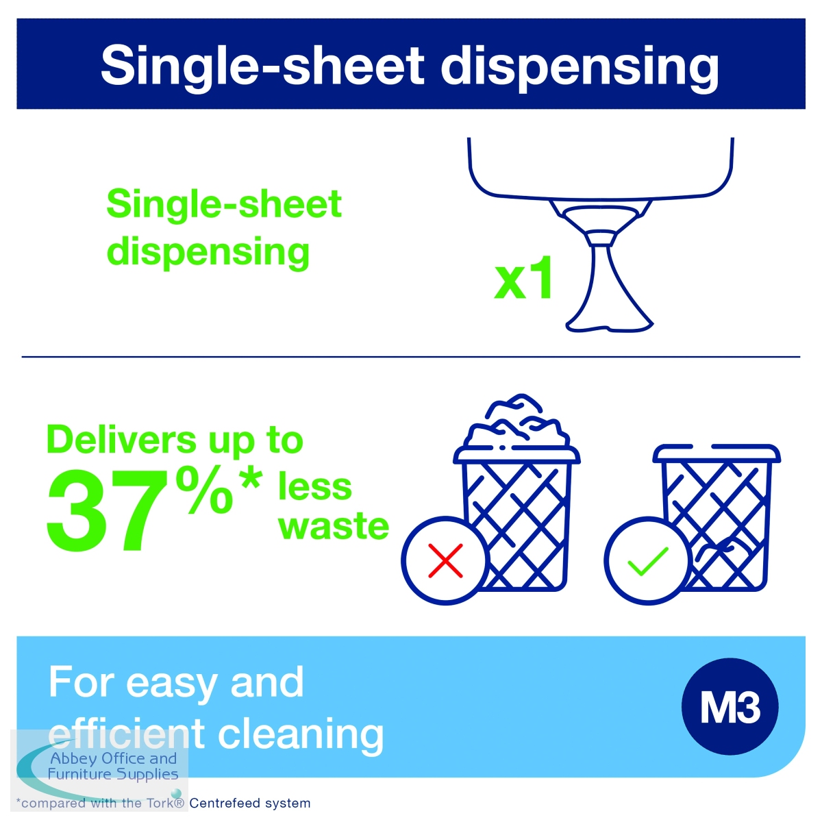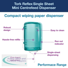 This robust Tork Reflex Dispenser is suitable for heavy daily use, providing a solution for both hand and surface wiping. Waste is reduced, thanks to single sheet dispensing which controls consumption by up to 37% compared with the Tork Centrefeed system and prevents the risk of cross-contamination. The run out indicator improves efficiency, so that refills can be planned in advance. It has a space saving design with a rotating nozzle, allowing it to fit into any working environment even if space is limited. Supplied in Turquoise, the dispenser is easy to clean with a removable hood. Key Features