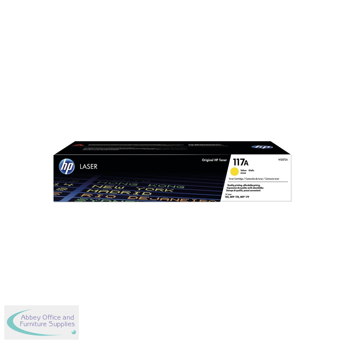 This HP 117A Yellow Original Laser Toner Cartridge is for use with HP Color Laser 150nw, 178nw and 179fnw printers. This toner cartridge has a print yield of up to 700 pages. This pack contains 1 yellow laser toner cartridge.