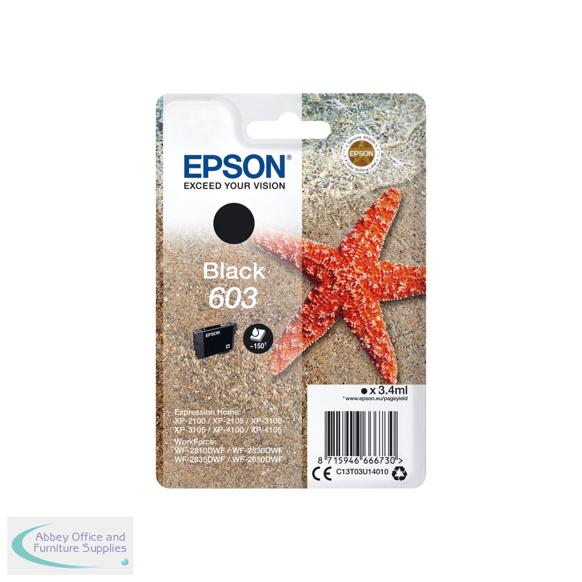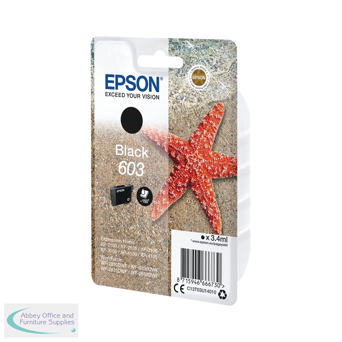 This Epson Starfish 603 Black Ink Cartridge is for use in Epson Expression Home XP-2100, XP-2105, XP-2150, XP-2155, XP-3100, XP-3105, XP-3150, XP-3155, XP-4100, XP-4105, XP-4150, XP-4155; WorkForce WF-2810DWF, WF-2820DWF, WF-2830DWF, WF-2835DWF, WF-2840DWF, WF-2845DWF, WF-2850DWF, WF-2870DWF inkjet printers. The cartridge contains 3.4ml of ink, with a print yield of up to 150 pages. This pack contains 1 black ink cartridge.