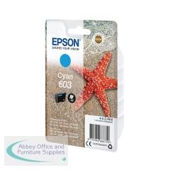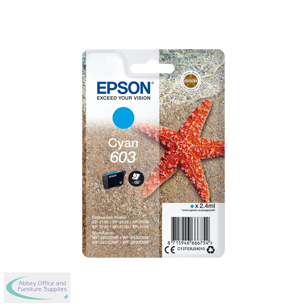 This Epson Starfish 603 Cyan Ink Cartridge is for use in Epson Expression Home XP-2100, XP-2105, XP-2150, XP-2155, XP-3100, XP-3105, XP-3150, XP-3155, XP-4100, XP-4105, XP-4150, XP-4155; WorkForce WF-2810DWF, WF-2820DWF, WF-2830DWF, WF-2835DWF, WF-2840DWF, WF-2845DWF, WF-2850DWF, WF-2870DWF inkjet printers. The cartridge contains 2.4ml of ink, with a print yield of up to 130 pages. This pack contains 1 cyan ink cartridge.