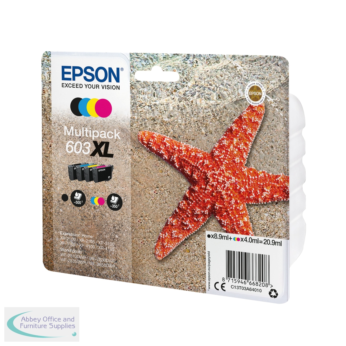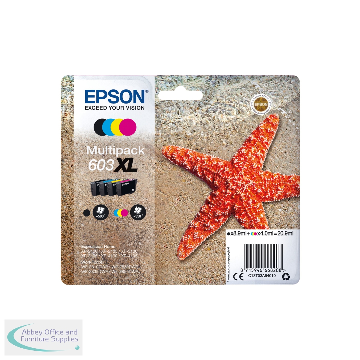 This Epson Starfish 603XL multipack contains cyan, magenta, yellow and black ink for use in Epson Expression Home XP-2100, XP-2105, XP-2150, XP-2155, XP-3100, XP-3105, XP-3150, XP-3155, XP-4100, XP-4105, XP-4150, XP-4155; WorkForce WF-2810DWF, WF-2820DWF, WF-2830DWF, WF-2835DWF, WF-2840DWF, WF-2845DWF, WF-2850DWF, WF-2870DWF inkjet printers. The black cartridge contains 8.9ml of ink, with a print yield of up to 500 pages and the colour cartridges contain 4ml of ink each, with a print yield of up to 350 pages. This pack contains 4 ink cartridges.