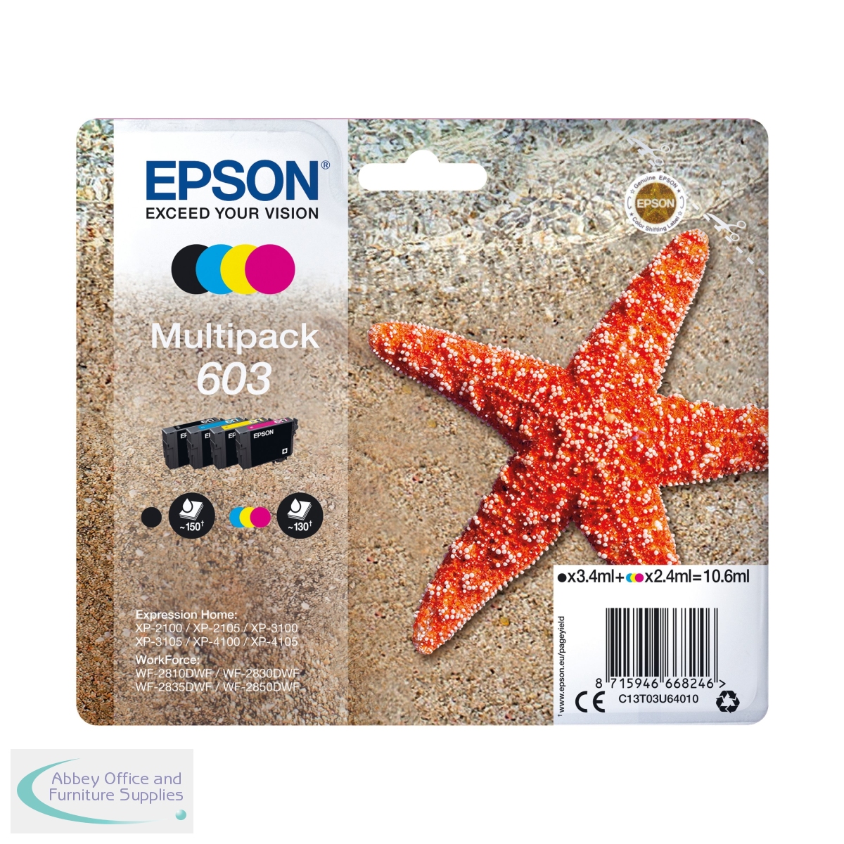 This Epson Starfish 603 multipack contains cyan, magenta, yellow and black ink for use in Epson Expression Home XP-2100, XP-2105, XP-2150, XP-2155, XP-3100, XP-3105, XP-3150, XP-3155, XP-4100, XP-4105, XP-4150, XP-4155; WorkForce WF-2810DWF, WF-2820DWF, WF-2830DWF, WF-2835DWF, WF-2840DWF, WF-2845DWF, WF-2850DWF, WF-2870DWF inkjet printers. The black cartridge contains 3.4ml of ink, with a print yield of up to 150 pages and the colour cartridges contain 2.4ml of ink each, with a print yield of up to 130 pages. This pack contains 4 ink cartridges.