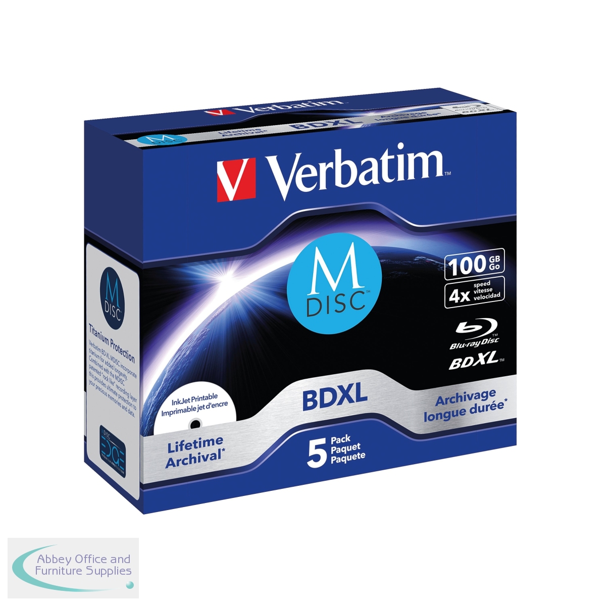 Boasting exceptional storage capacity of 100GB, these MDSIC BDXL 4x discs from Verbatim are exceptionally durable methods of archiving data. Incorporated with highly resilient titanium for an expected lifetime of up to 1,332 years, these discs are compatible with inkjet printers for easy filing and are supplied in a pack of 5.