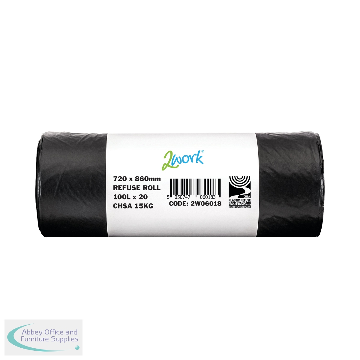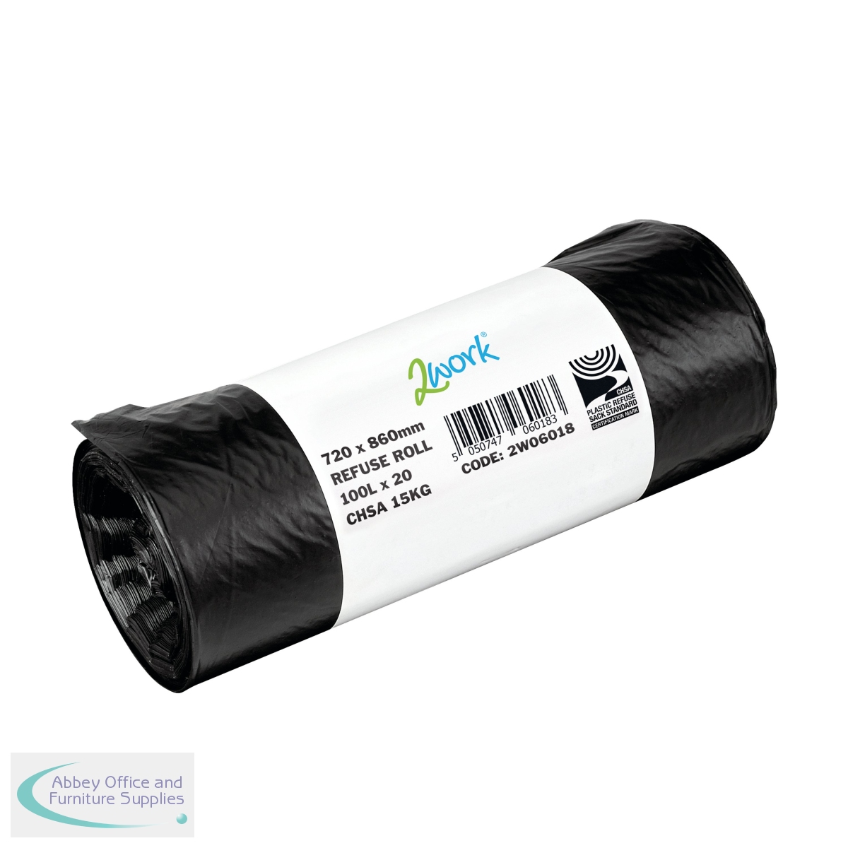 2W06018 - 2Work Refuse Sack 100 Litre Black 20 Bags per Roll (Pack of 10) 2W06018