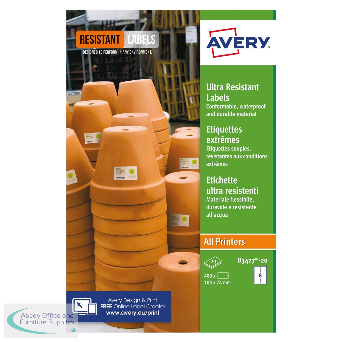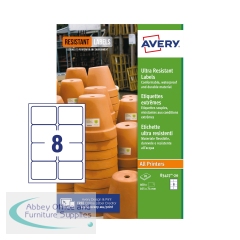 Avery Ultra Resistant Labels are made from a durable and waterproof film material with extra strong adhesive making them suitable for safe and permanent marking even outdoors in wind and rain. Ideal for outdoor storage use, the white label material is BS5609 Part 2 certified for label and adhesive durability for at least 90 days in seawater and is approved by the Globally Harmonized System (GHS), chemical hazard labelling for marking of chemicals for transport by sea/air. Being resistant to chemicals, abrasion, UV, water, tearing and extreme temperature changes from -40C to + 150C, these are the ultimate choice for industrial labelling of containers such as drums, jugs, bottle, cans, flask and dropper bottles and beakers. Each label measures 74 x 105mm and this pack contains 20 sheets, with 8 labels per sheet (160 labels in total).