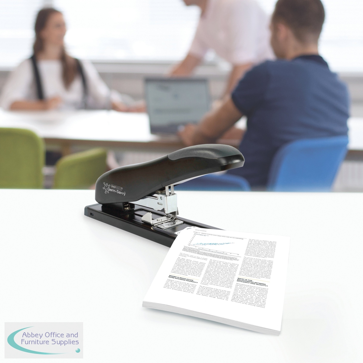 The powerful Rapesco ECO HD-100 is a heavy duty stapler that takes the effort out of stapling with a capacity of up to 100 sheets of 80gsm paper. This stapler is particularly useful when stapling larger bundles of paper accurately thanks to its unique paper guide locking system. With full strip, push button front loading this stapler also features a soft rubber handle grip for user comfort and non slip rubber feet for added stability. Uses 923/6-13mm staples. Finished in black and manufactured from a high level of recycled plastic, this stapler is backed by a 25 year guarantee.