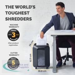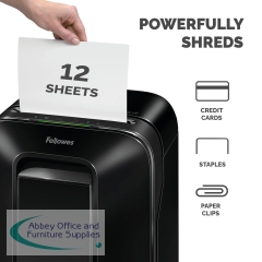 The Fellowes LX201 is an innovative and efficient shredder, designed for individual use. With the capability to shred 12 A4 sheets into 2 x 12mm micro-cut particles for a high security level of P-5; the LX201 has a host of intelligent features to maximise your efficiency, including Safesense technology and Sleep Mode to reduce energy consumption in addition to the Fellowes IntelliBar, providing you with in-use feedback on bin capacity and usage information. With a runtime of up to 10 minutes and a 22 litre pull-out bin, this black shredder is both easy to use and highly efficient.