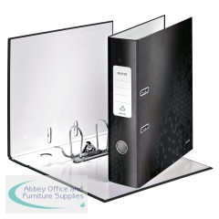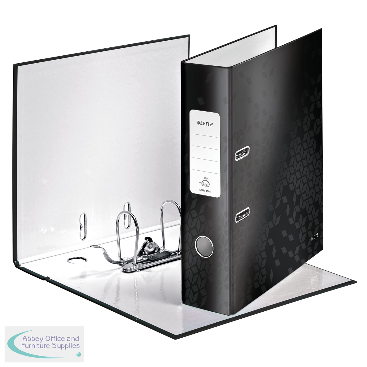 This bright, stylish Leitz WOW lever arch file features a unique, patented filing mechanism that opens 180 degrees for ease of use. The file has an 80mm capacity for up to 600 sheets of 80gsm paper. The file also features a metal thumb hole for easy retrieval from a shelf and a large spine label for quick identification of contents. Suitable for A4 filing, the file is made from glossy, laminated paper over board. Ideal for colour coordinated filing, this pack contains 10 black lever arch files.