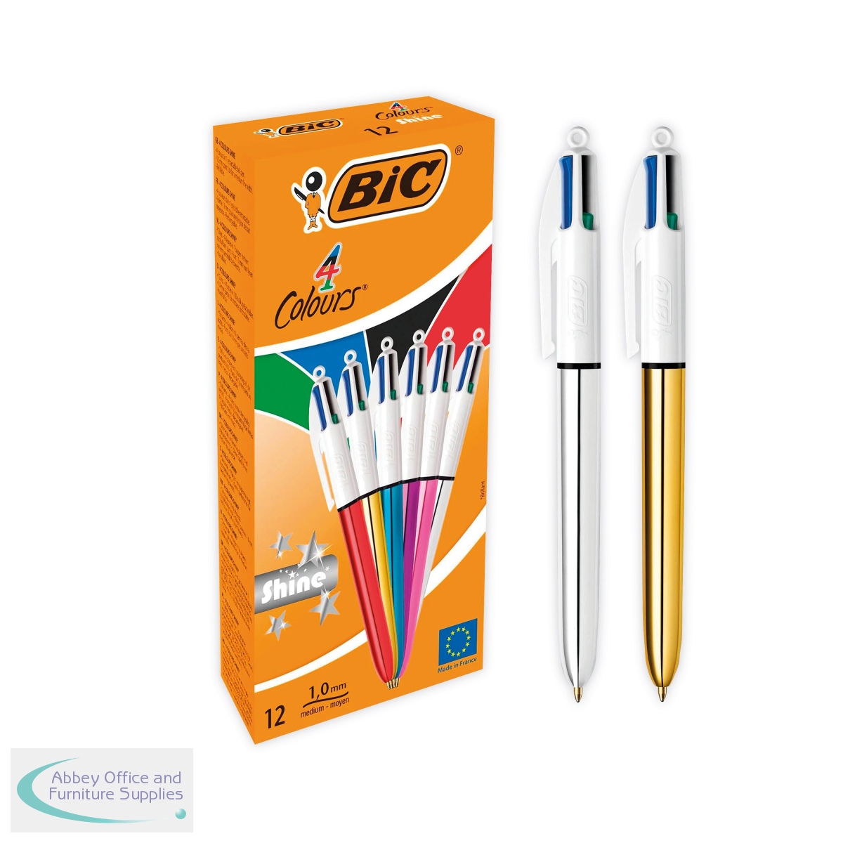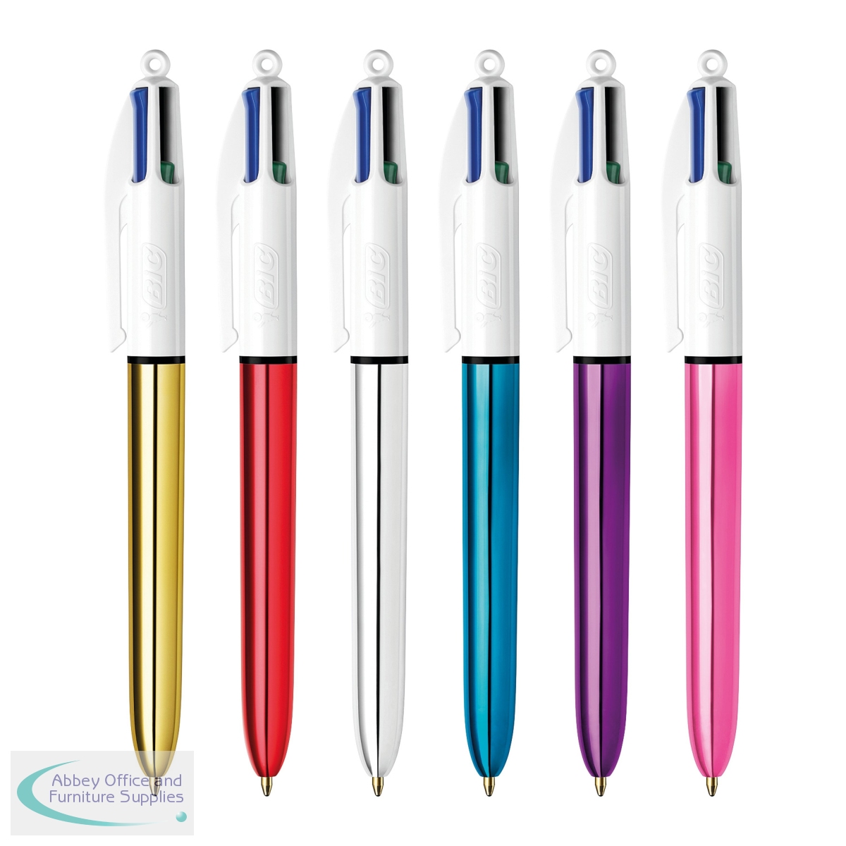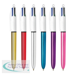 Add some colour to your desktop with this assorted pack of Bic 4 Colour Ballpoint Pens. They feature inks in four colours which can be easily selected and changed with the sliders for colour coded note taking and marking. The pens come in assorted metallic colours with a pocket clip for use on the go.