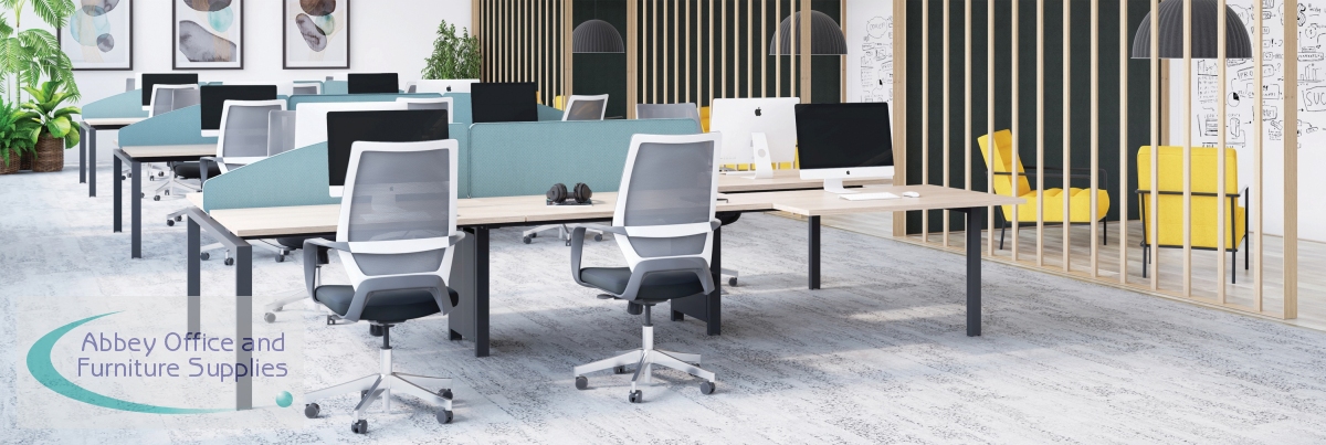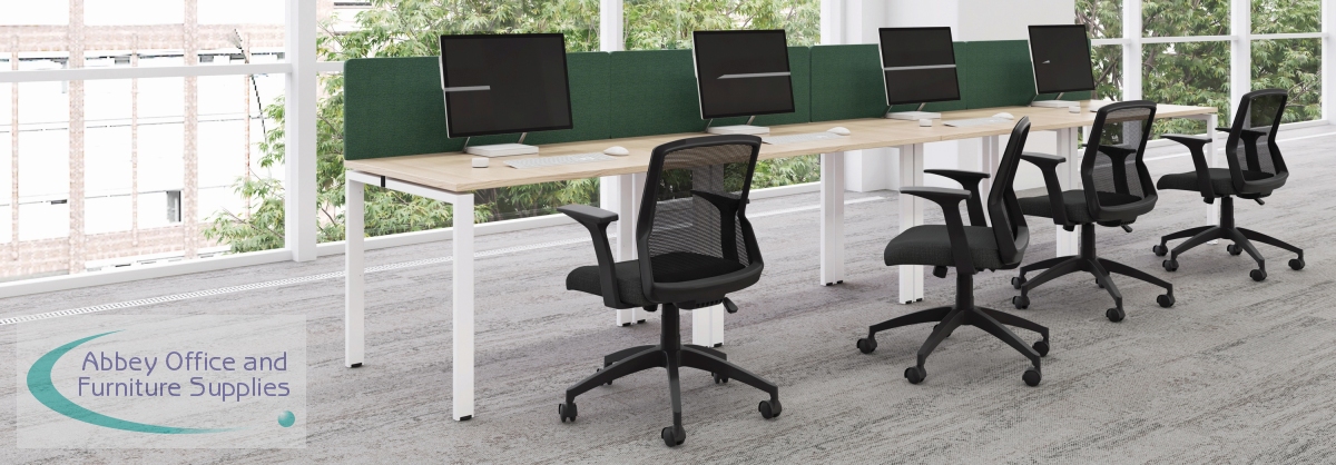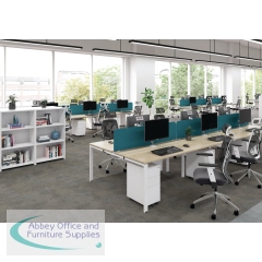 The Jemini Bench System Desking is ideal for offices where space is at a premium. Each bench desk has a tubular steel leg construction with an MFC finish floating top effect. The scalloped desktops allow for easy access to cables. Each single person desk measures 1400x1600x730mm.