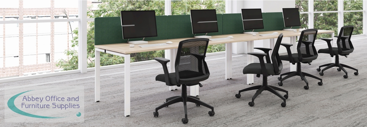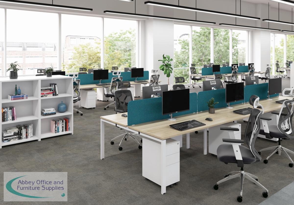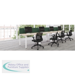 The Jemini Bench System Desking is ideal for offices where space is at a premium. Each bench desk has a tubular steel leg construction with an MFC finish floating top effect. The scalloped desktops allow for easy access to cables. Each bench desk measures 1400x1600x730mm.