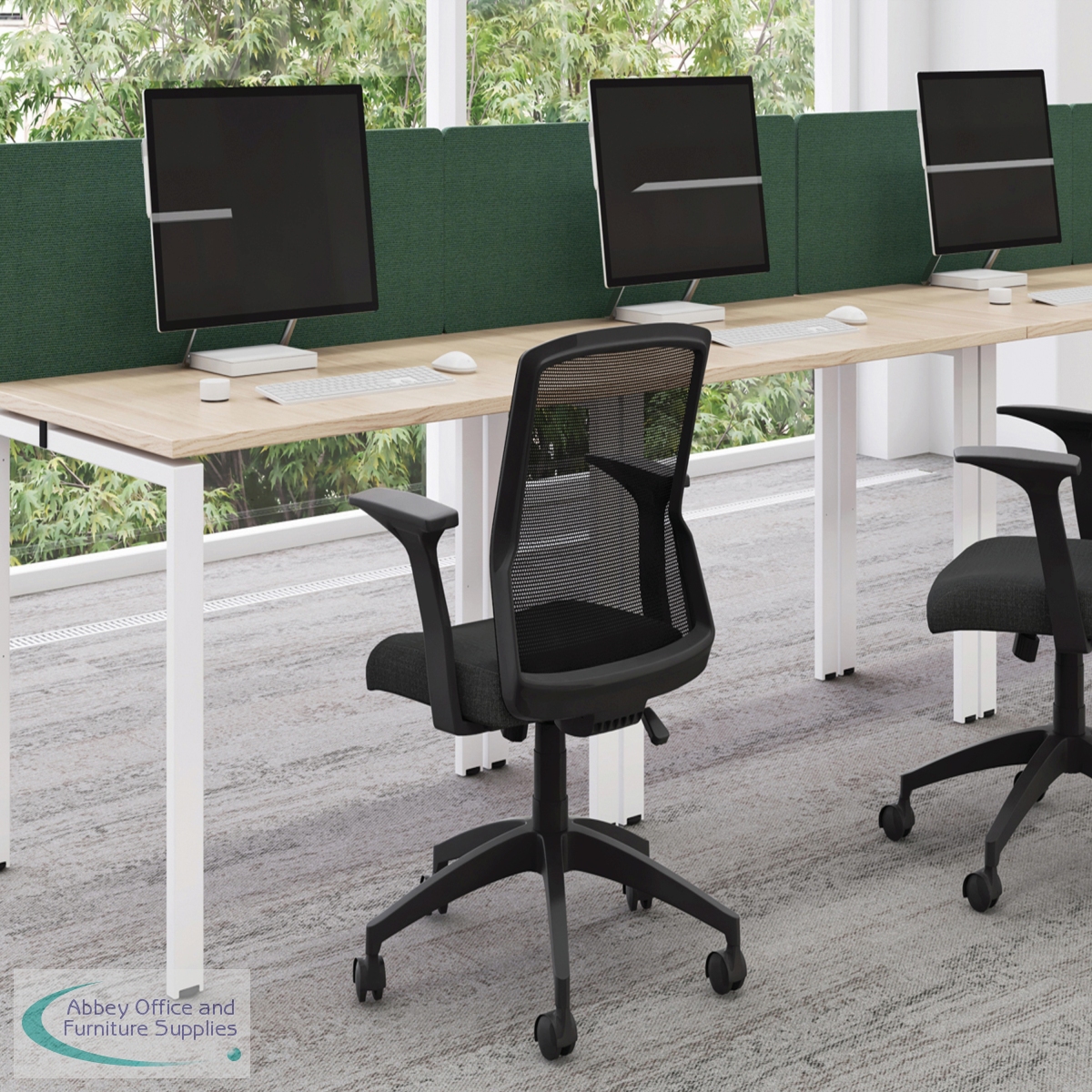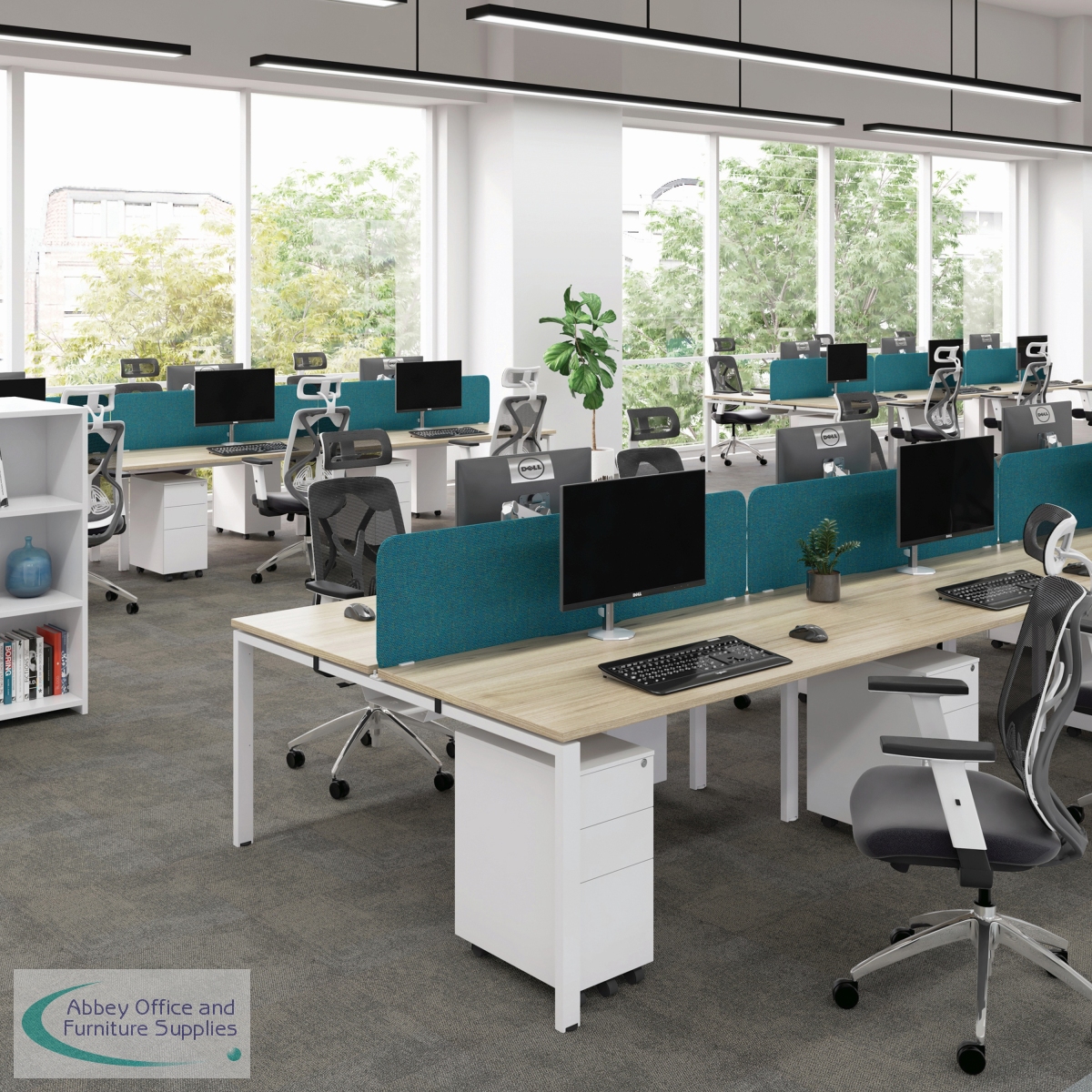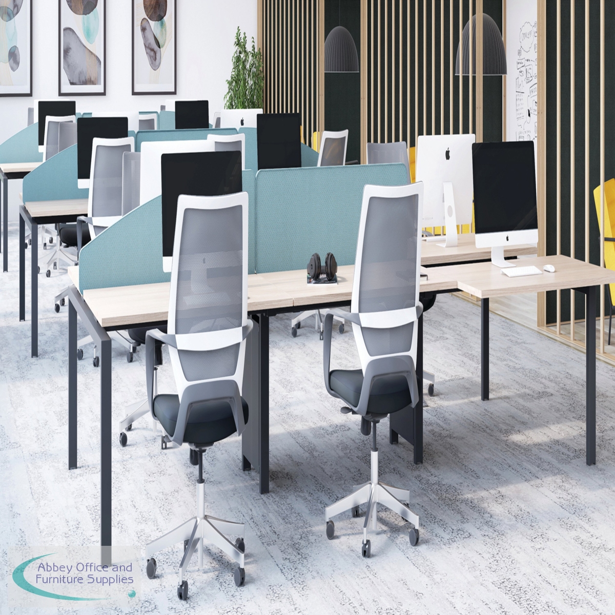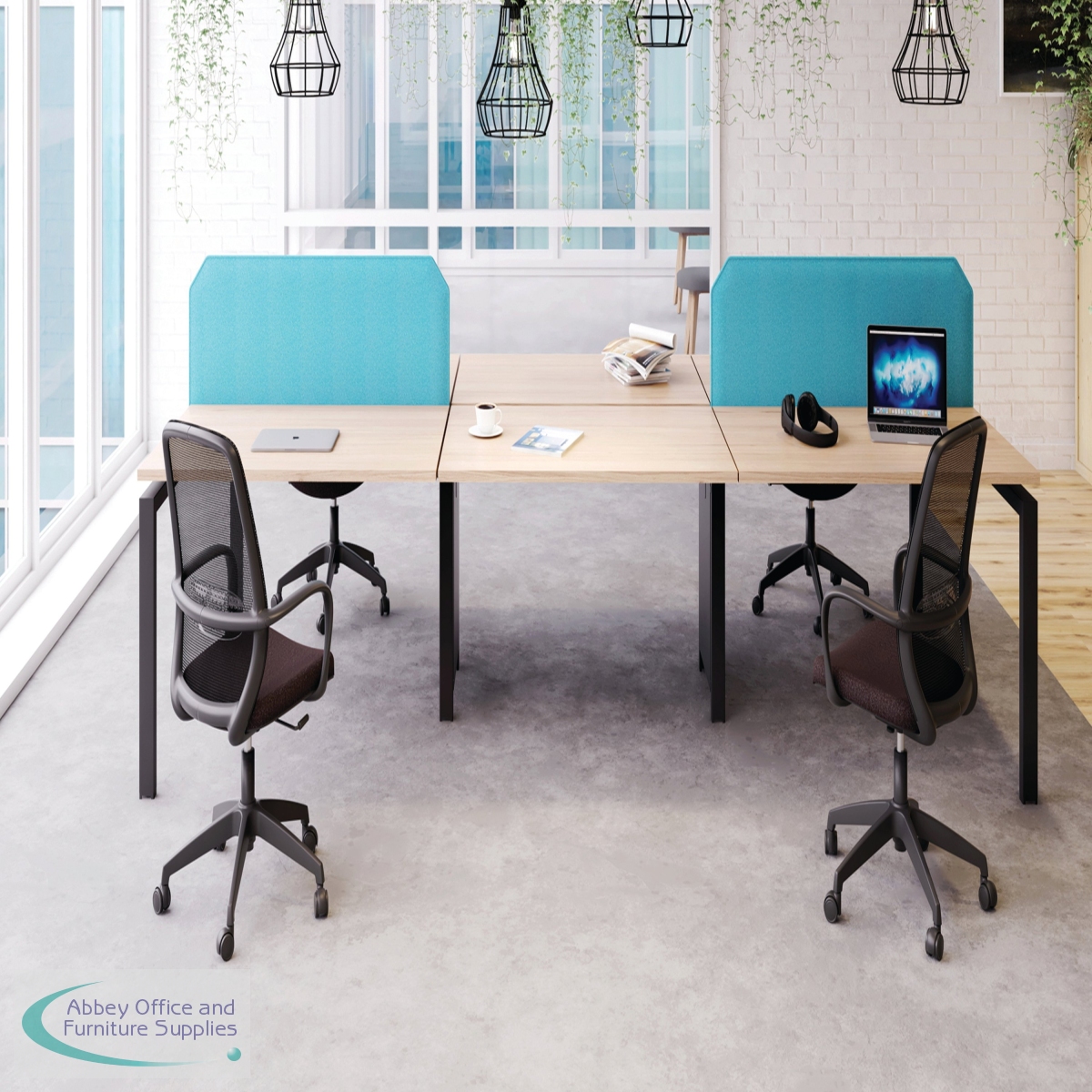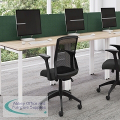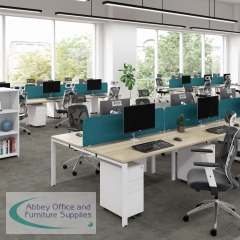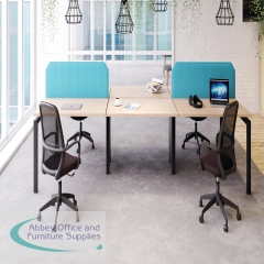The Jemini Bench System Desking is ideal for offices where space is at a premium. Each bench desk has a tubular steel leg construction with an MFC finish floating top effect. The scalloped desktops allow for easy access to cables. Each single person desk measures 1600x1600x730mm.