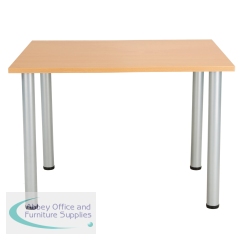 This Jemini Rectangular Meeting Table is ideal for use in meeting, training rooms and breakout areas. Combine with other tables in the range to form a configuration that suits you. The desk features four tubular metal legs with a 25mm thick MFC desktop finished in beech. This table measures 1200x800x730mm.