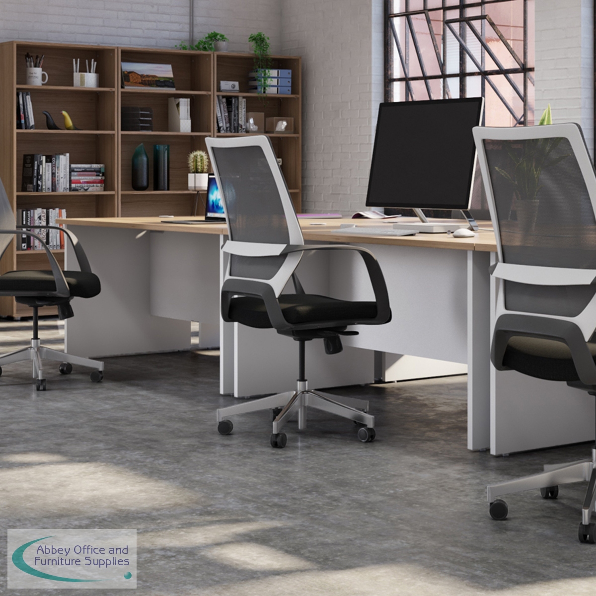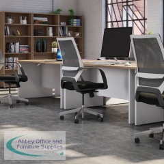 The Jemini Switch range combines traditional desking with contemporary styling, contrasting worktops with white panel end legs. Suitable for use in a variety of office environments, the desk includes a modesty panel as standard with dual 62mm cable management ports to keep worktops tidy. The radial design gives easy access to computers with increased worktop space.