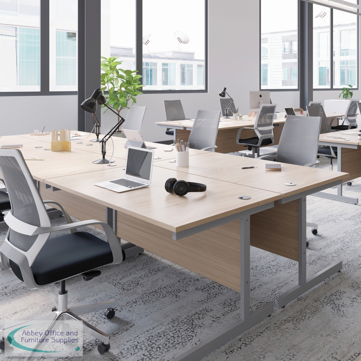 Suitable for use in a variety of office environments. This Jemini Rectangular Cantilever Desk features a strong cantilever frame for support and stability. The desk features a Top Thickness: 25mm with dual 62mm cable management ports to keep workspaces tidy and free from wires. The desk includes a modesty panel as standard and is suitable for use with Jemini Under Desk Pedestals.