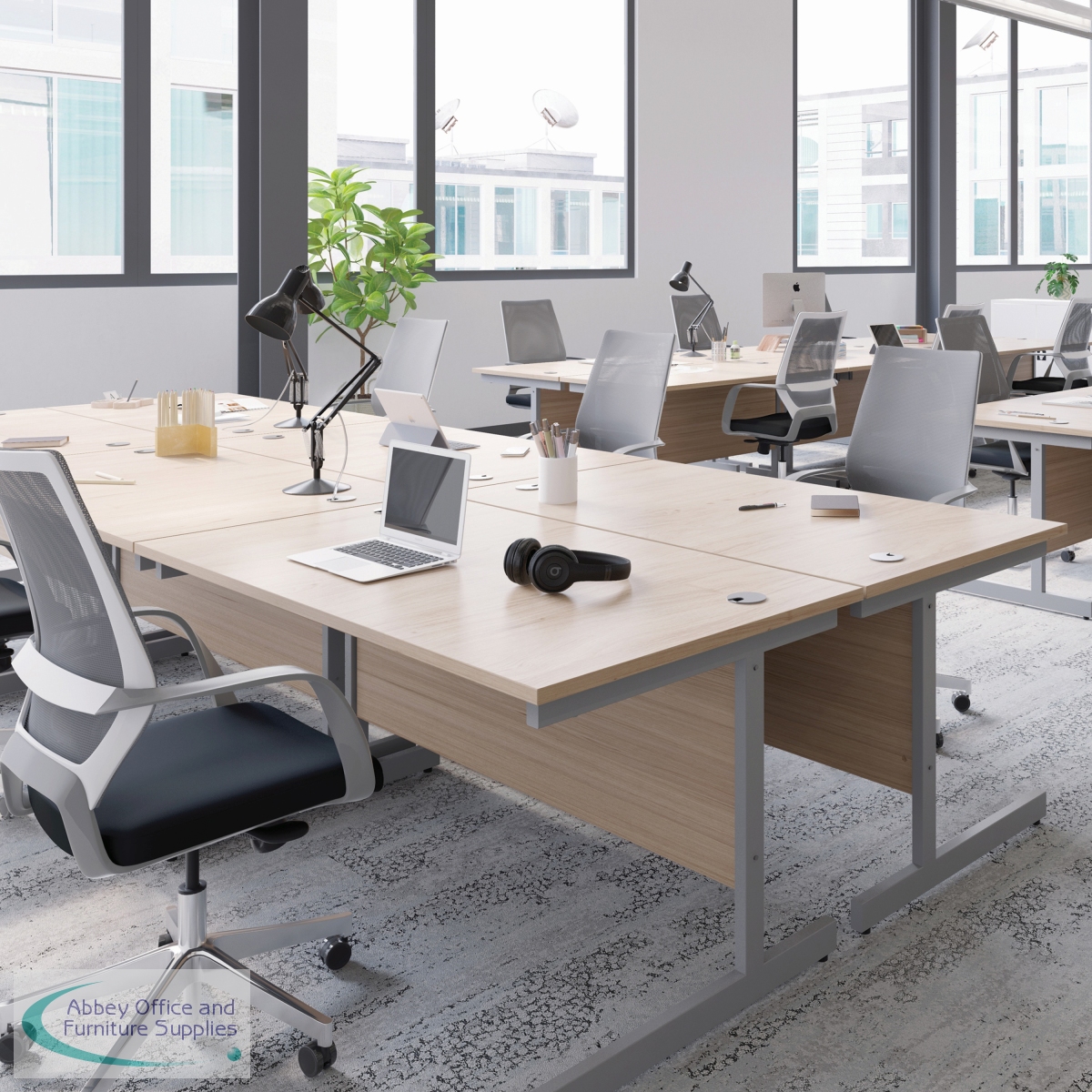 Suitable for use in a variety of office environments. This Jemini Rectangular Cantilever Desk features a strong cantilever frame for support and stability. The desk features a Top Thickness: 25mm with dual 62mm cable management ports to keep workspaces tidy and free from wires. The desk includes a modesty panel as standard and is suitable for use with Jemini Under Desk Pedestals.
