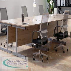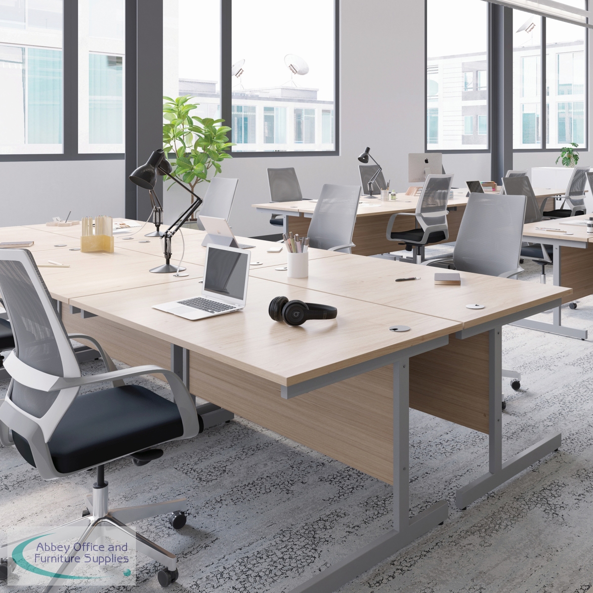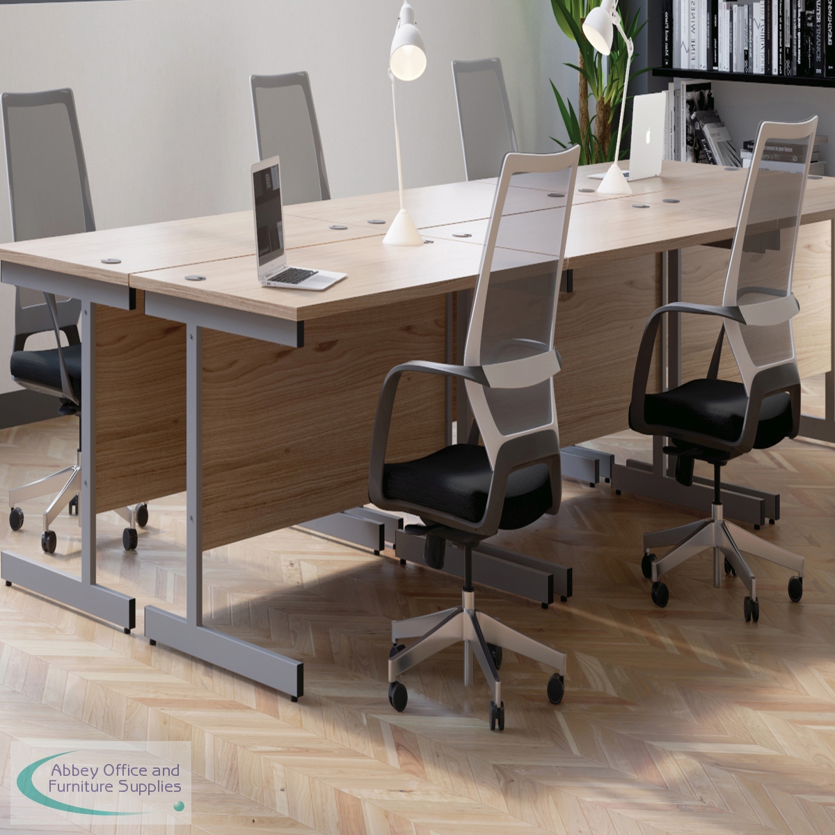 Suitable for use in a variety of office environments. This Jemini Rectangular Cantilever Desk features a strong cantilever frame for support and stability. The desk features a Top Thickness: 25mm with dual 62mm cable management ports to keep workspaces tidy and free from wires. The desk includes a modesty panel as standard and is suitable for use with Jemini Under Desk Pedestals.