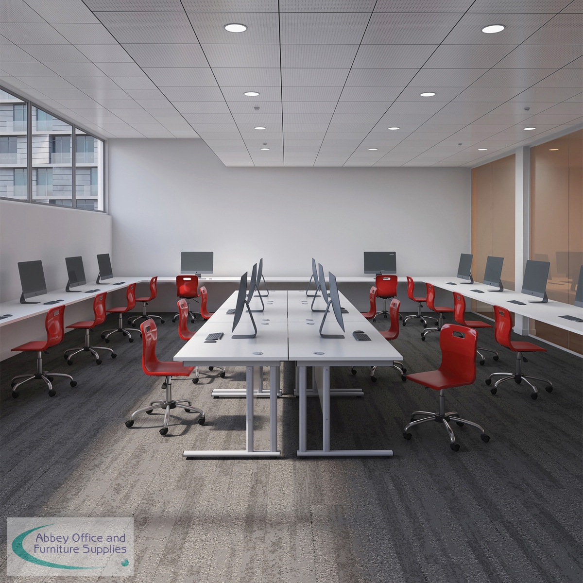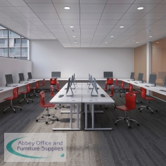 This Jemini Cantilever Desk features double upright legs for improved stability, with height adjustable feet up to 10mm. The 25mm thick MFC desktop features 2mm edge banding and 80mm dual cable management ports. Ideal for a variety of office environments.