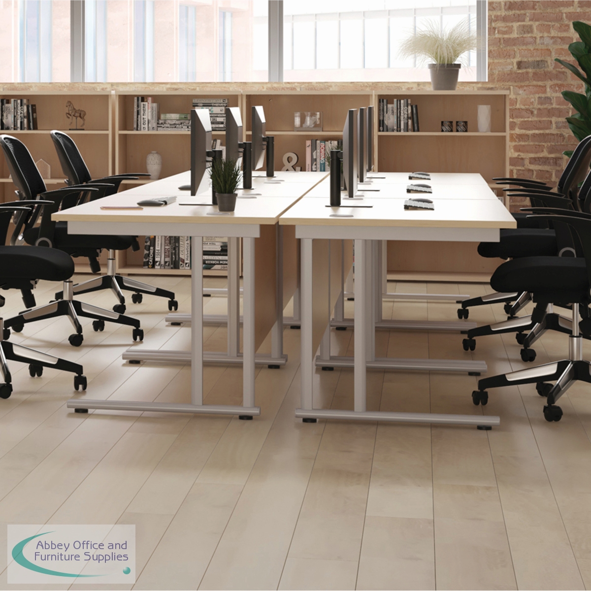 This Jemini Cantilever Desk features double upright legs for improved stability, with height adjustable feet up to 10mm. The 25mm thick MFC desktop features 2mm edge banding and 80mm dual cable management ports. Ideal for a variety of office environments.