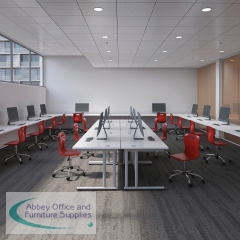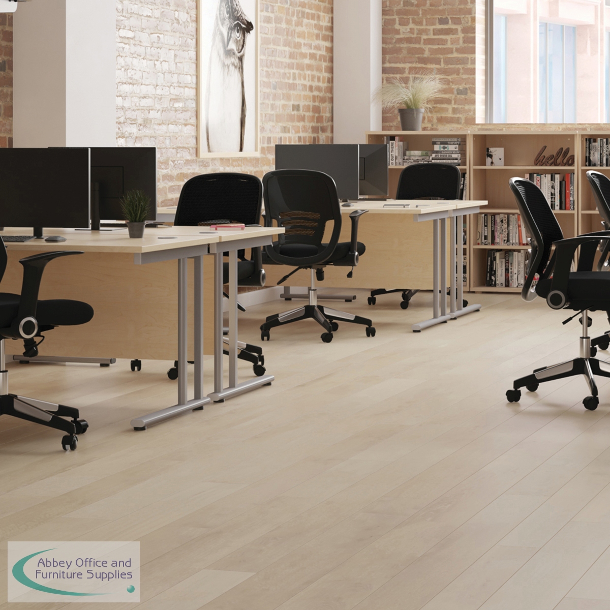 This Jemini Cantilever Desk features double upright legs for improved stability, with height adjustable feet up to 10mm. The 25mm thick MFC desktop features 2mm edge banding and 80mm dual cable management ports. Ideal for a variety of office environments.
