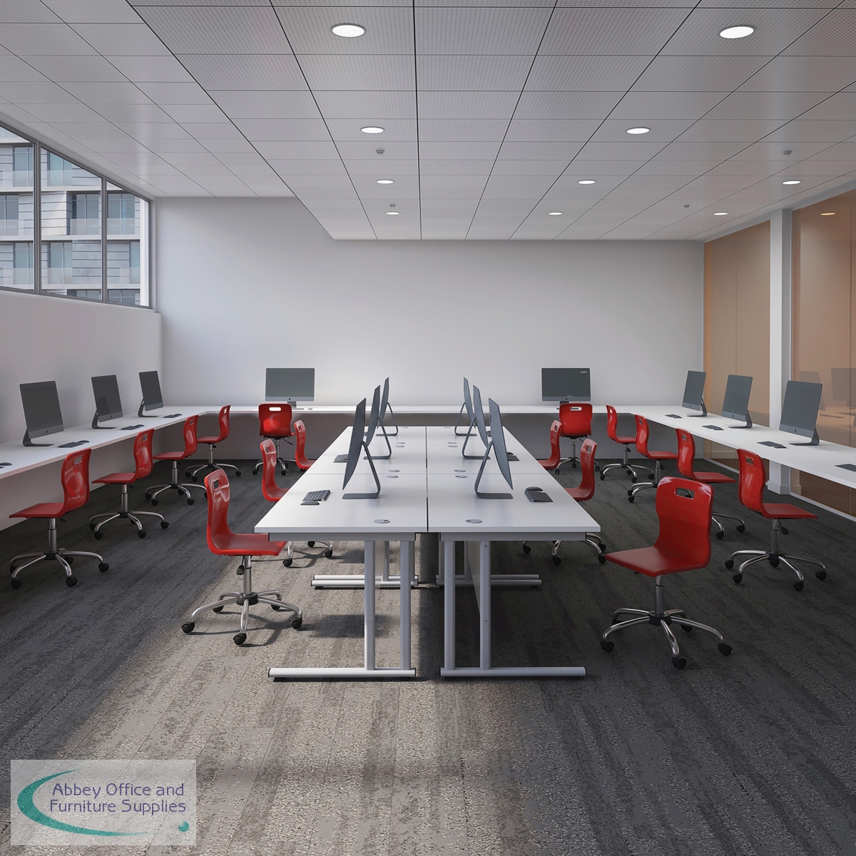 Suitable for use in a variety of office environments. This Jemini Cantilever Desk features double upright legs for improved stability, with height adjustable feet up to 10mm. The radial design offers easy working access to your computer, as well as ample additional desktop space. The 25mm thick MFC desktop features 2mm edge banding and 80mm dual cable management ports. The desk includes a modesty panel as standard and is suitable for use with Jemini Fixed Pedestals on the 800mm end.