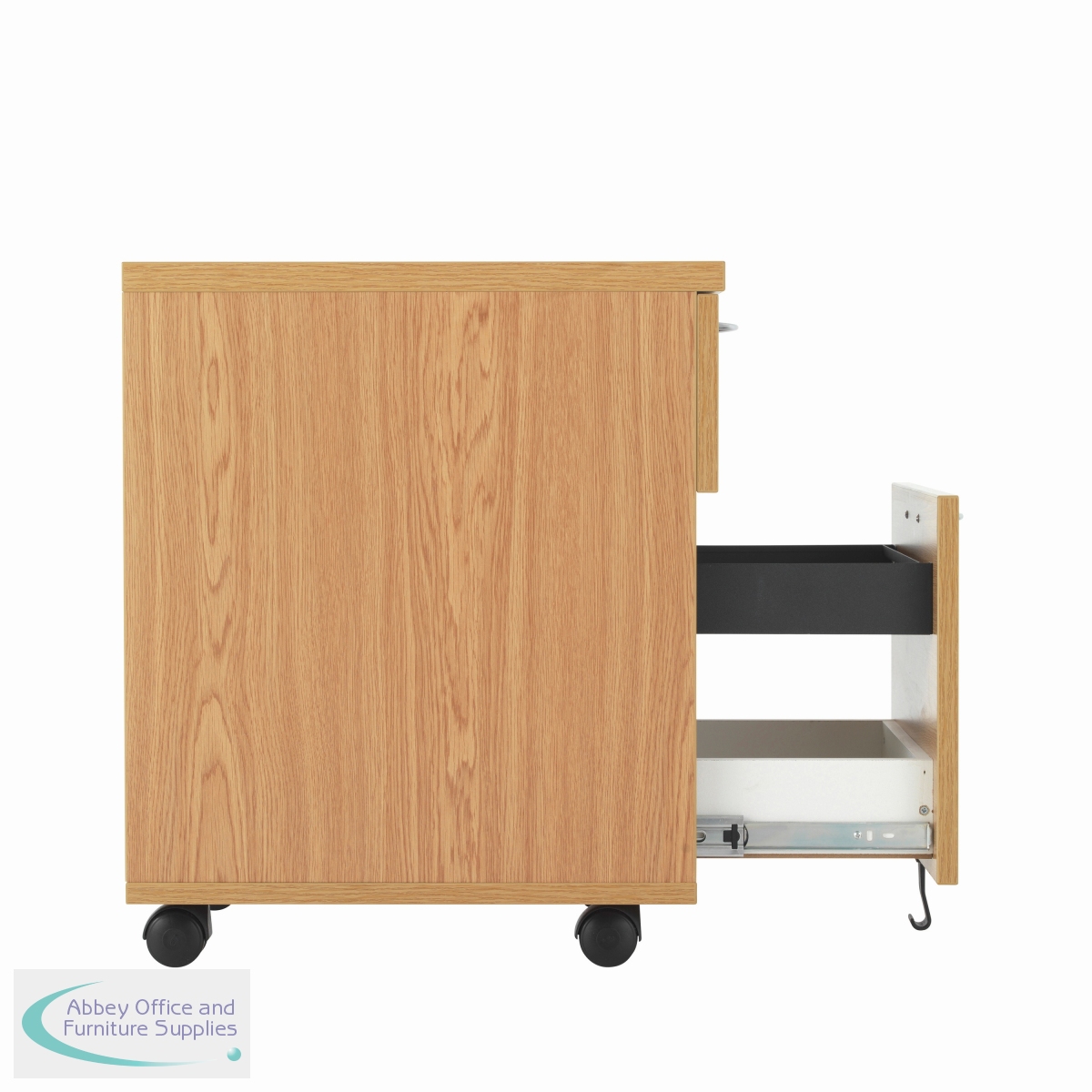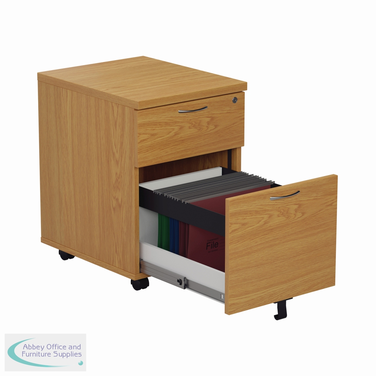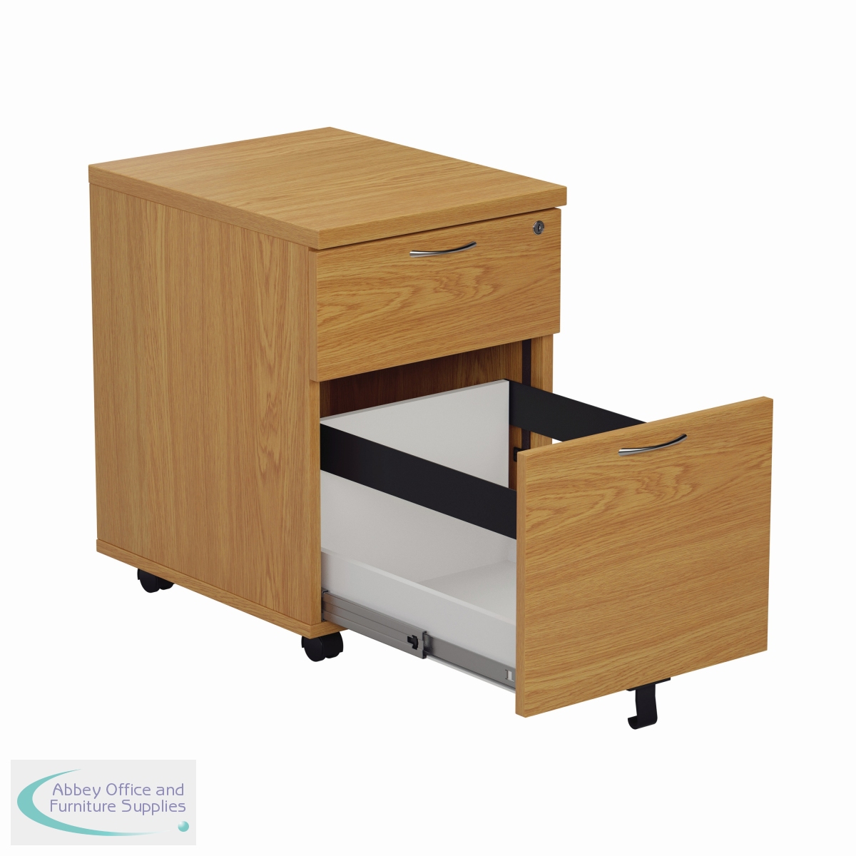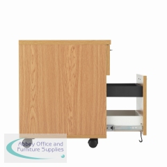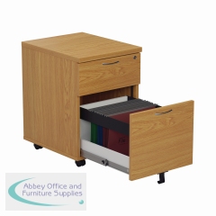Finished in Nova Oak, this Jemini mobile pedestal features 2 drawers consisting of 1 box drawer and 1 foolscap size filing drawer. Designed for use under desks or for use independently, the pedestal measures W404 x D500 x H595mm with a desktop depth of 25mm.