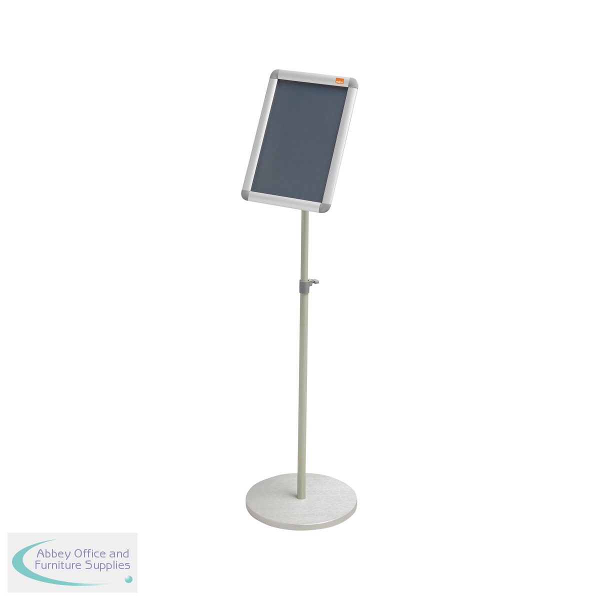 A4 poster frame stand for the clear display of posters, signs and important information. The smart aluminium snap frame trim allows easy poster change and provides a professional finish. This freestanding display stand is an ideal portable sign holder solution. The stand is height adjustable from approximately 850mm to 1400mm high and the poster frame can be positioned in portrait or landscape orientation. Protective anti-glare cover surface. Display area A4.