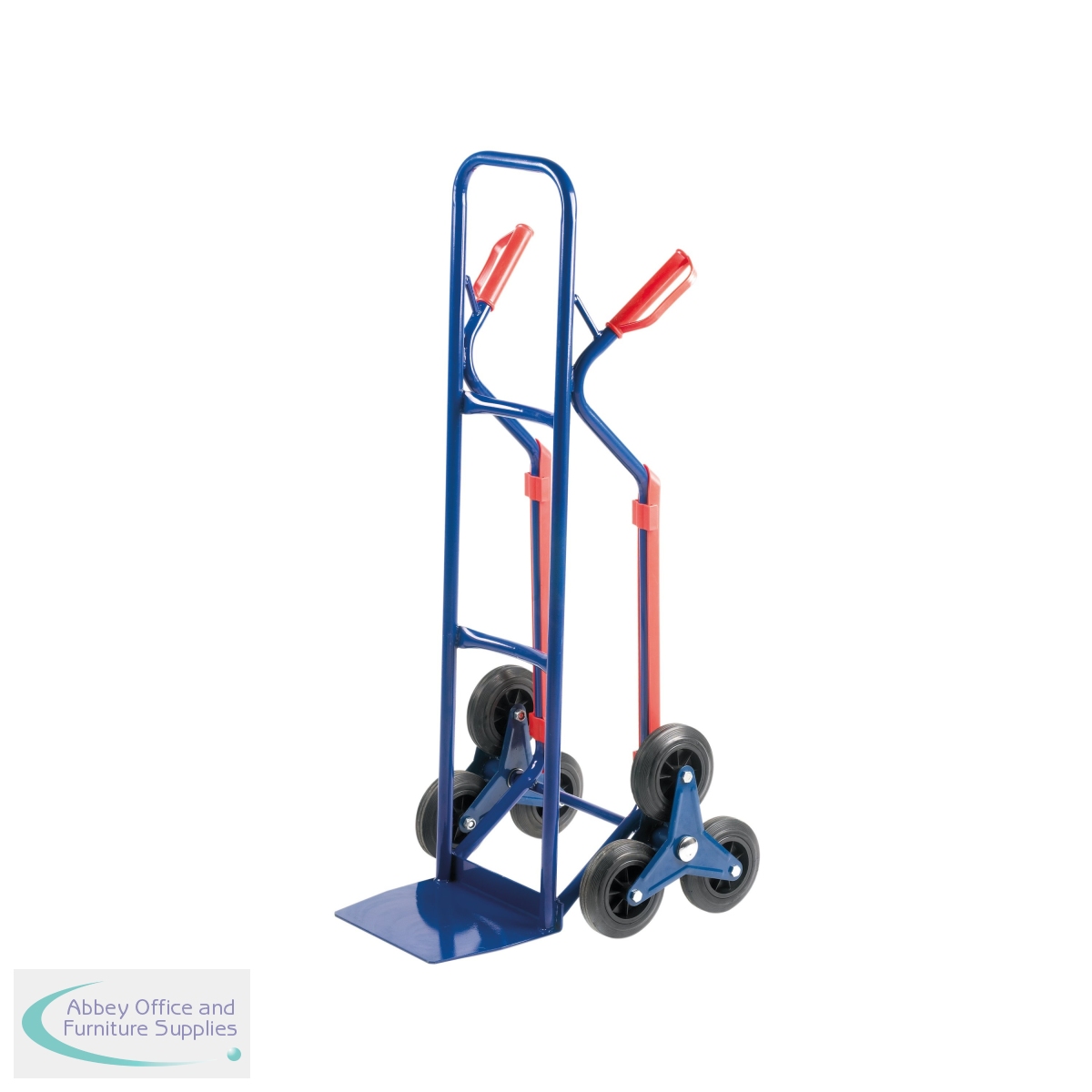 This GPC Stairclimber Sack Truck features specially designed 150mm wheels on a 3 star system for easier and safer transport of heavy loads up stairs. The sack truck comes fitted with knuckle guard hand grips and has a maximum weight capacity of 60kg on stairs and 150kg on level ground. The Stairclimber has a toe plate measuring 300 x 245mm and also comes with plastic coated skids. The blue sack truck measures W480 x D600 x H1180mm.