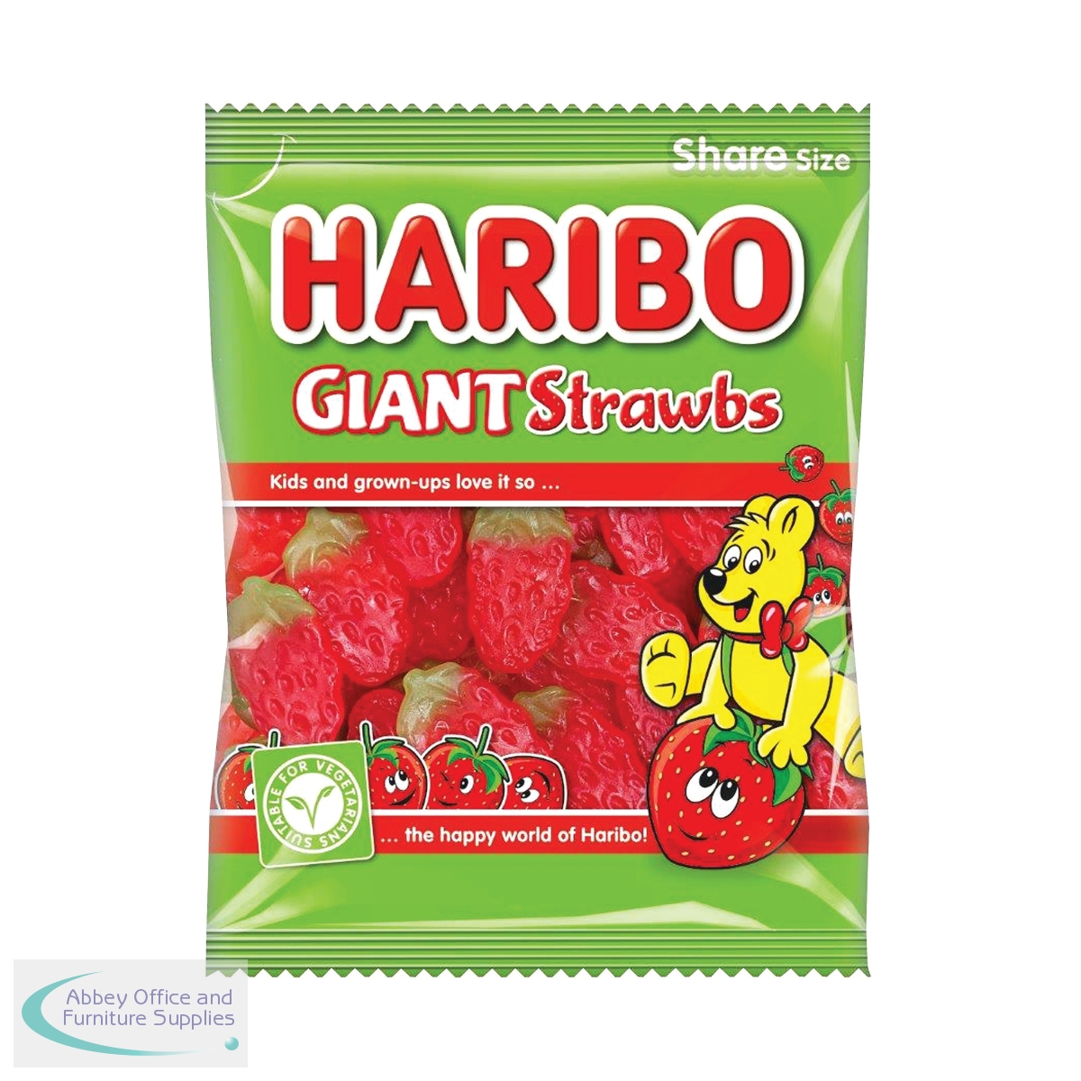 Share some fun and tasty snacks with this pack of 12 Haribo Giant Strawbs. Giant in size and in flavour, these strawberry shaped sweets taste of delicious strawberry with a chewy texture. Suitable for vegetarians and a firm family favourite, these 160g bags are the perfect size for sharing.