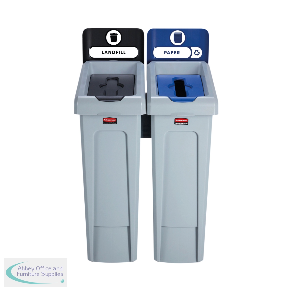 This Rubbermaid Slim Jim Recycling Station includes two streams for an adaptable recycling solution. It includes two bases, lids and slot lid inserts for landfill and paper channels. The components easily snap into place and include venting channels for easy bin liner removal.