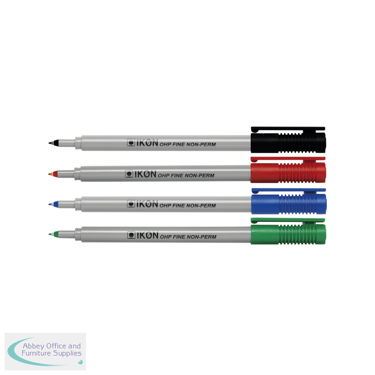 These non-permanent overhead projector pens contain soluble water-based ink that can easily be erased with a damp cloth. Supplied in a wallet of 4, these projector pens have a grey barrel with coloured lids to identify the ink colour. Assorted colours including black, red, blue and green.