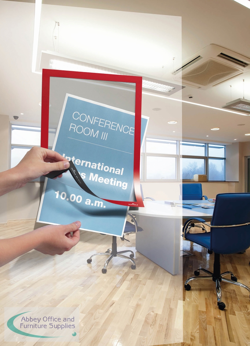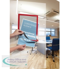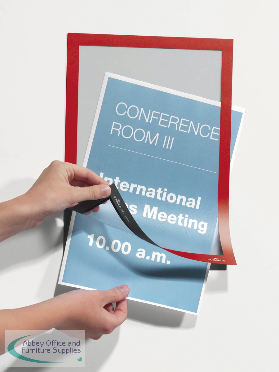 The self-adhesive info frame Duraframe is the ideal solution for displaying information on solid and smooth surfaces. The inserts can be quickly exchanged thanks to the magnetic fold-back frame. When applied to glass, the information can be read from both sides and will leave no residue when removed. Perfect for displaying notices, signage, safety information in any workplace or at home.