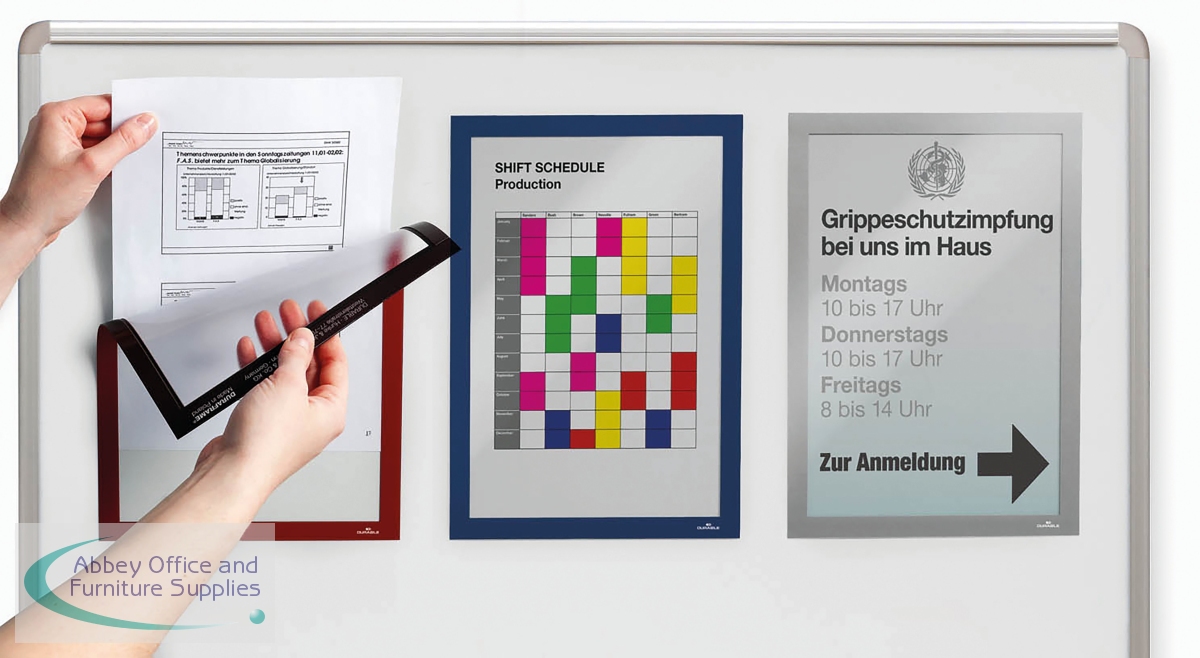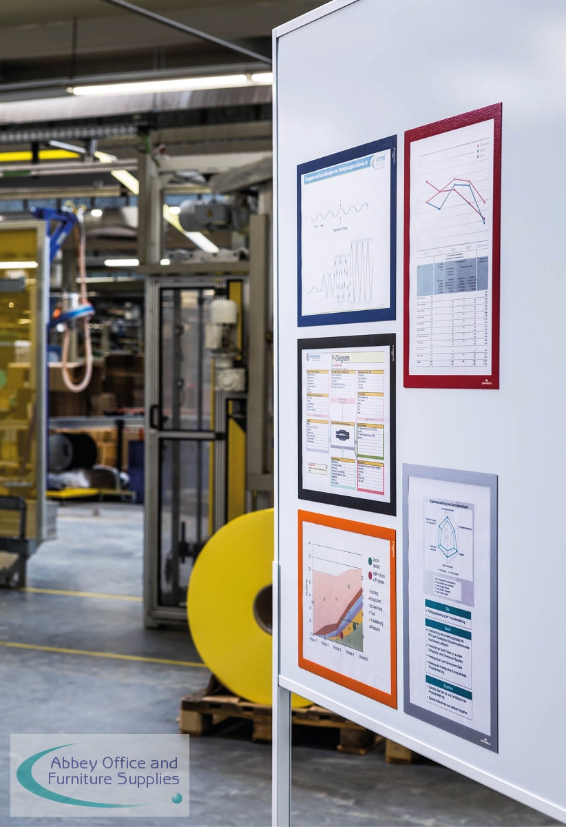 The magnetic info frame DURAFRAME is the ideal solution for displaying documents and notices on metal surfaces. The inserts can be quickly exchanged simply by lifting the magnetic frame away from the surface. Perfect for displaying information such as health and safety information and machinery maintenance checks in warehouse and production areas or on whiteboards around the office.
