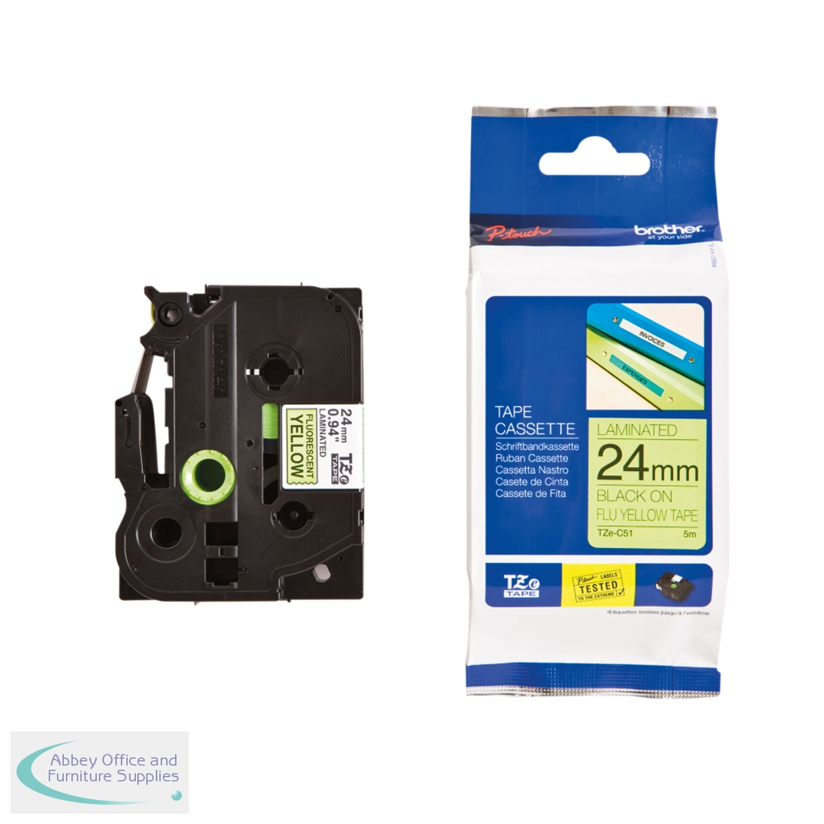 The TZeB51 Black on Fluorescent Yellow labelling tape is specifically designed for use with the Brother range of label printers. Measuring 24mm wide and 8m in length, this laminated tape has been rigorously tested to stand up to even the most unforgiving conditions. Designed to last with excellent resistance to water, abrasion, chemicals and temperature extremes.