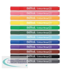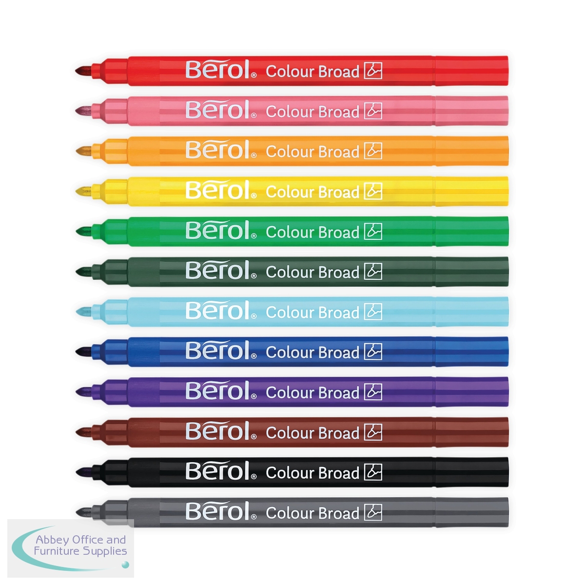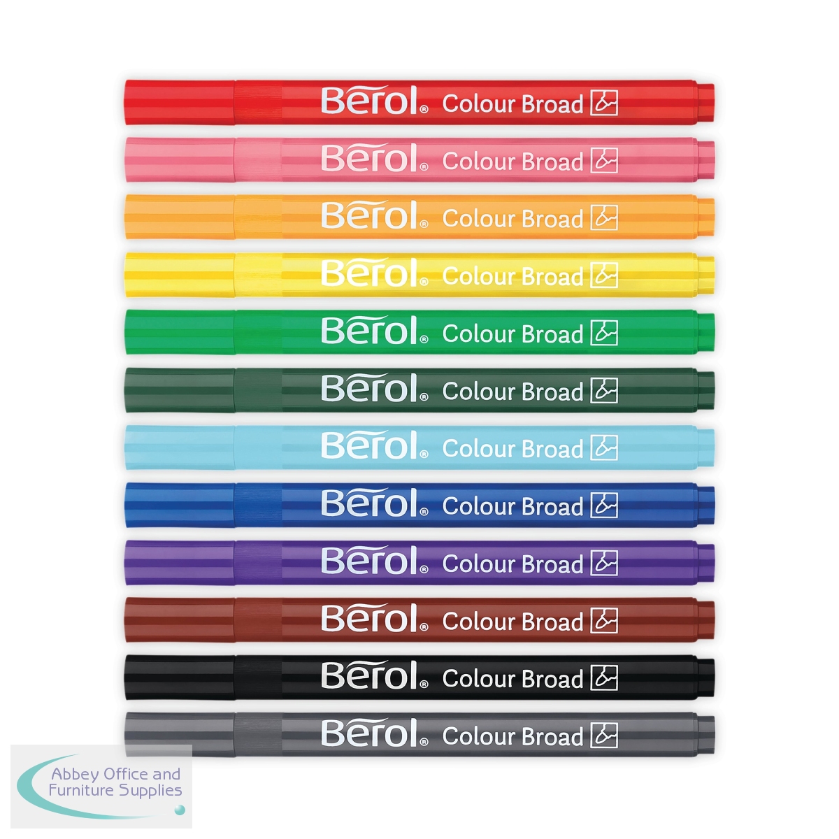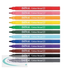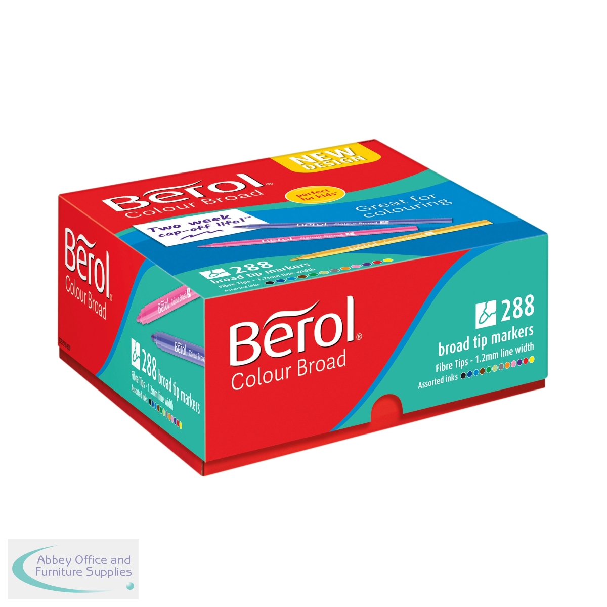 This set of Berol Colour Broad felt tip pens are filled with vivid, washable ink for endless colouring and writing fun. The broad felt tip is hardwearing and bold to help children with a wide range of drawing and writing activities. The cap can also be left off for at least 14 days without drying out. This pack of 288 pens, in 12 assorted colours is ideal for use in academic settings.
