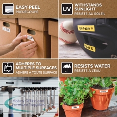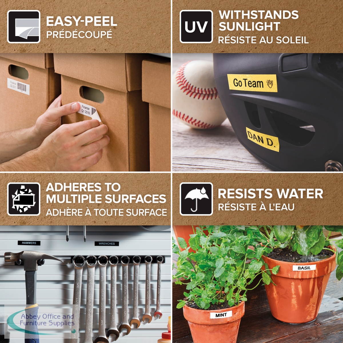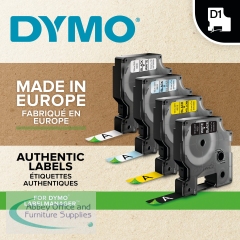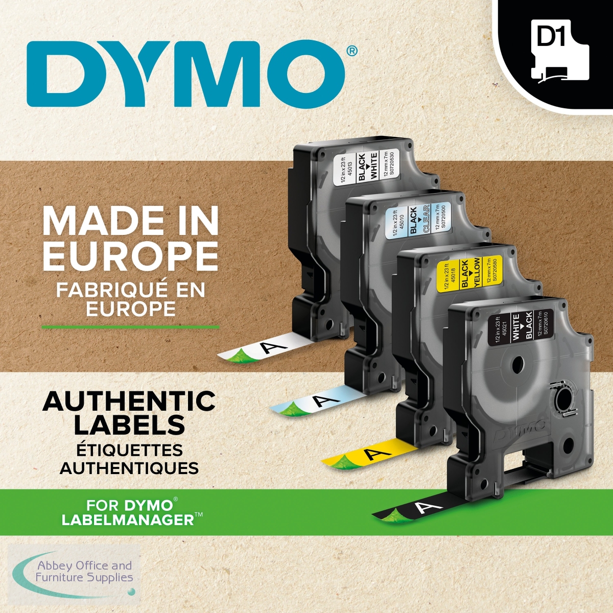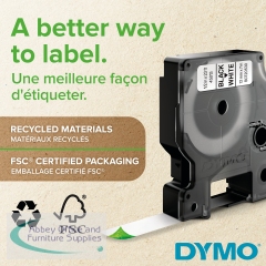 With black text on a white background, this Dymo D1 labelling tape is ideal for a range of uses. Made from strong polyester, the tape features a strong self-adhesive backing that's suitable for almost all surfaces. Slot the cassette into your label maker and get labelling your stationery, equipment, files, folders and more. This tape cartridge is compatible with Dymo LabelManager models. The tape is 12mm wide and comes supplied on 7 metre roll.