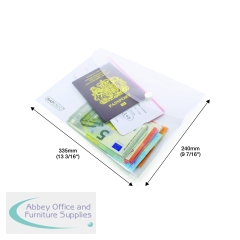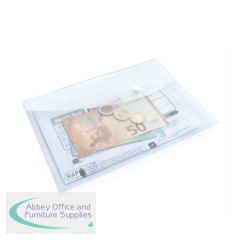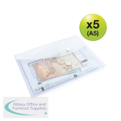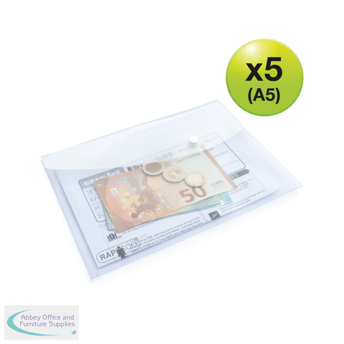 A5 plastic popper wallets made from durable recycled polypropylene. Featuring a white press-stud closure on the curved fold-over flaps, these folders keep contents safe and secure, making them perfect for general storage and holding loose papers at the office, at home, or on the go. Featuring a handy pen holder cutout under the curved flap and a large capacity of 75 sheets of 80 gsm paper, up to A5 in size, these files come in convenient packs of 5.