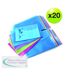 A4+ size Popper Wallets made with durable recycled polypropylene sheet material. It is popular as a general storage file for loose papers when attending meetings or keeping papers tidy for filing. Its large capacity will hold up to 150 pages, and it also features a foldover flap with colour-coordinated press-stud closure to keep papers secure. Under the curved flap, you will also find a pen holder. The pack contains 20 popper wallets in assorted bright colours for easy colour-coordinated filing.