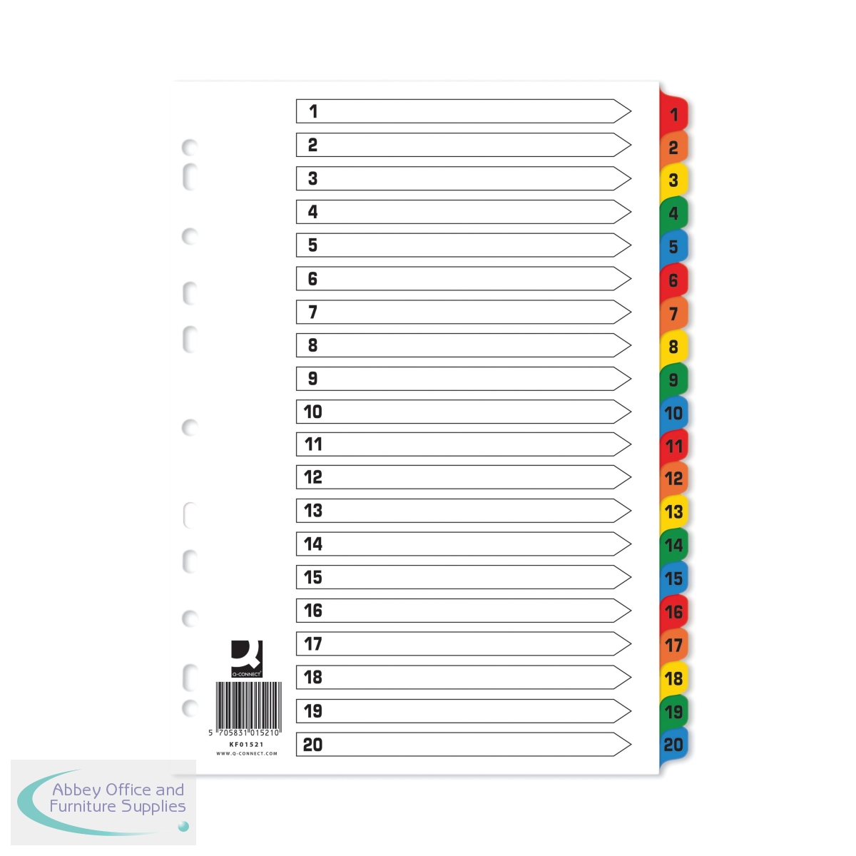 This Q-Connect 1-20 numbered index divider provides a clear and simple filing solution for your everyday office needs. The front index sheet provides space for labelling to make referencing your notes quick and easy. It is made from plain white board with multicoloured tabs for extra reinforcement. This index comes with pre-printed tabs (1-20) and is multi-punched to fit standard lever arch files or ring binders.