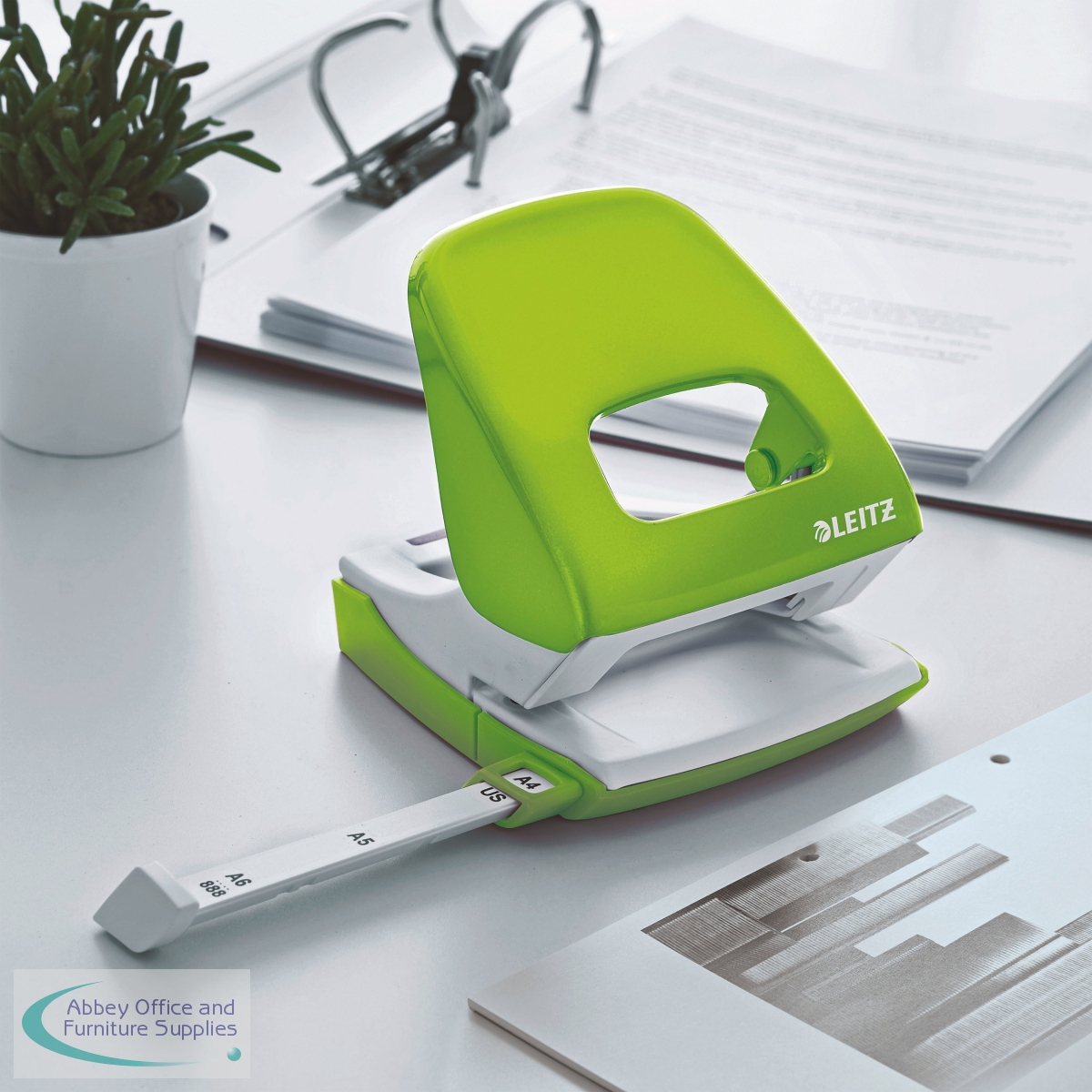 Leitz NeXXt metal punch in striking WOW colours that let your personality shine through. 2 hole punch for everyday use. Robust and reliable with a punching capacity of 30 sheets of 80gsm paper. Patented easy slide-in grip zone and ultra sharp stamps reduce punching effort. Green.