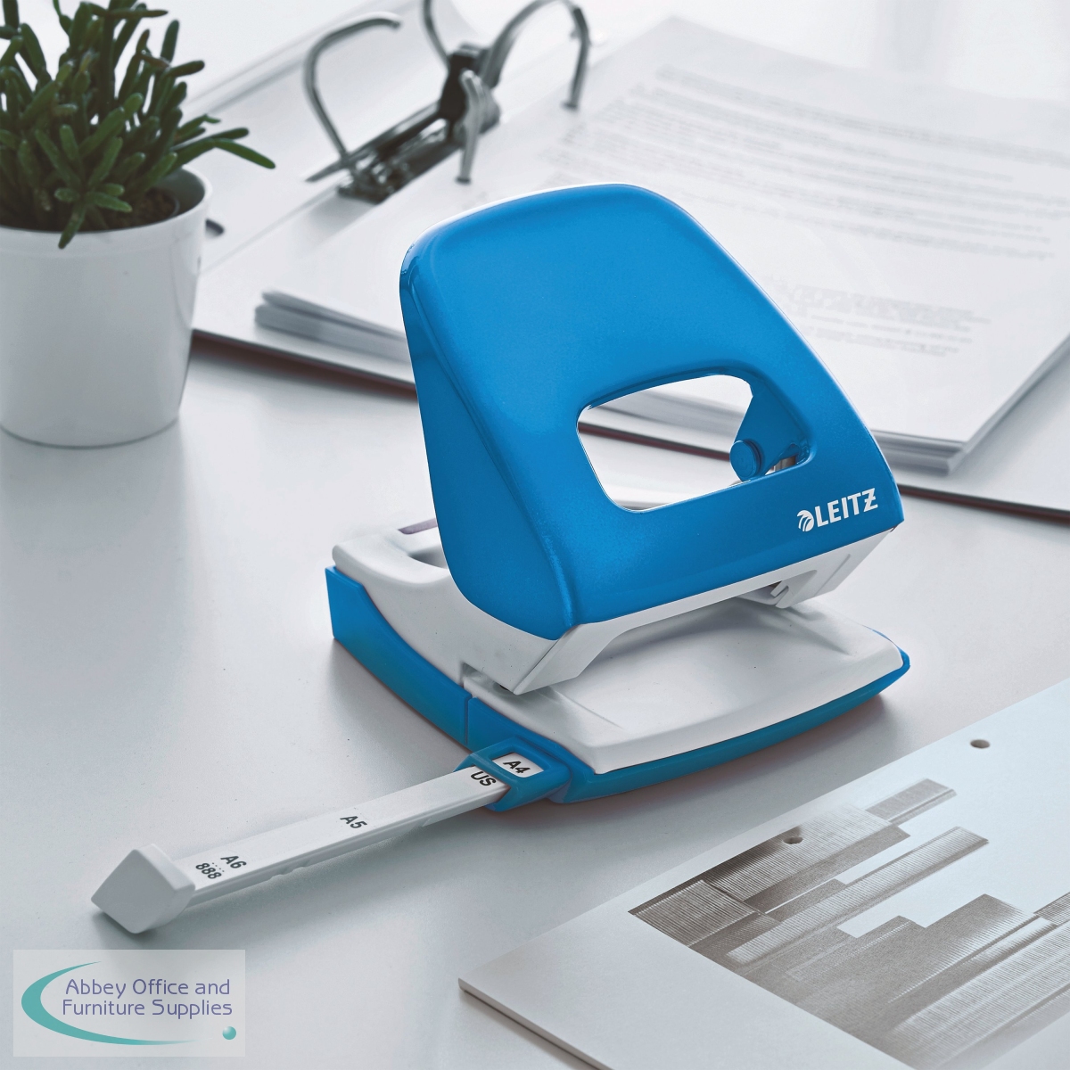 Leitz NeXXt metal punch in striking WOW colours that let your personality shine through. 2 hole punch for everyday use. Robust and reliable with a punching capacity of 30 sheets of 80gsm paper. Patented easy slide-in grip zone and ultra sharp stamps reduce punching effort. Metallic blue.