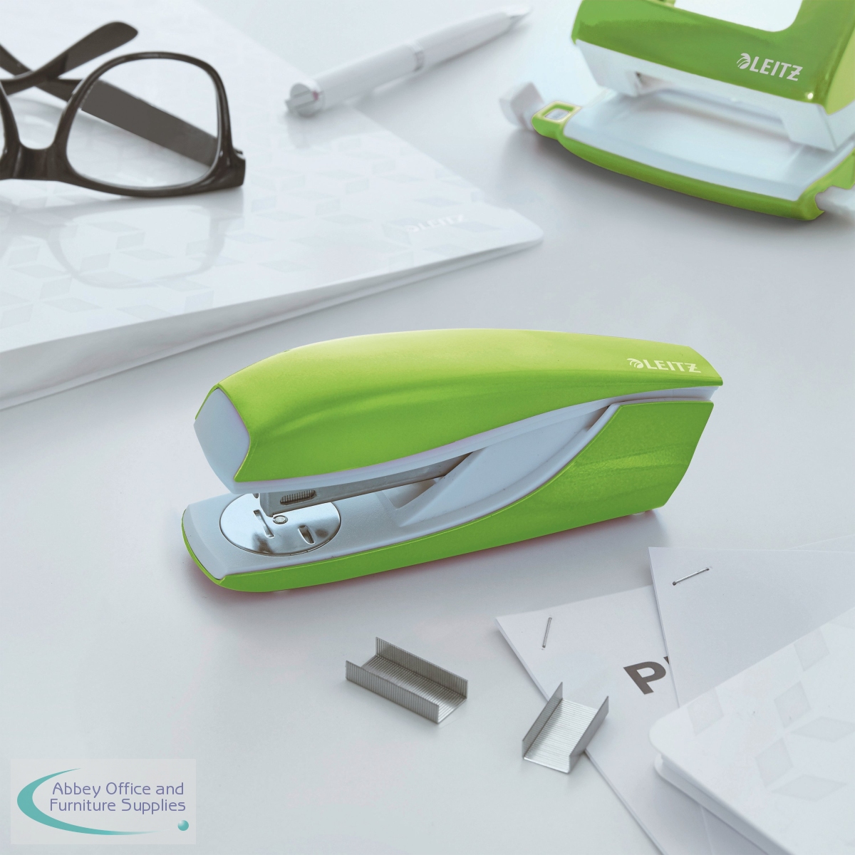 Metal stapler in striking WOW colours that let your personality shine through. For everyday use. Robust and reliable with the capacity to staple up to 30 sheets of 80gsm paper. Patented Direct Impact Technology and Leitz Power Performance staples P3 (24/6, 26/6) ensure perfect stapling every time. With a handy integrated staple remover. Green.