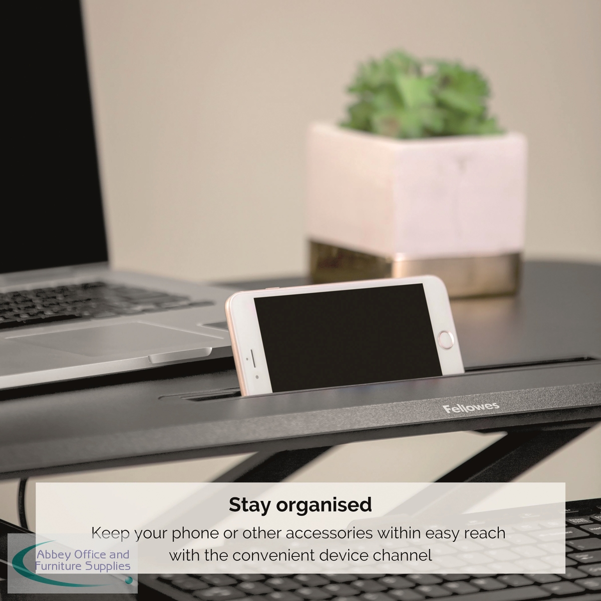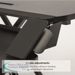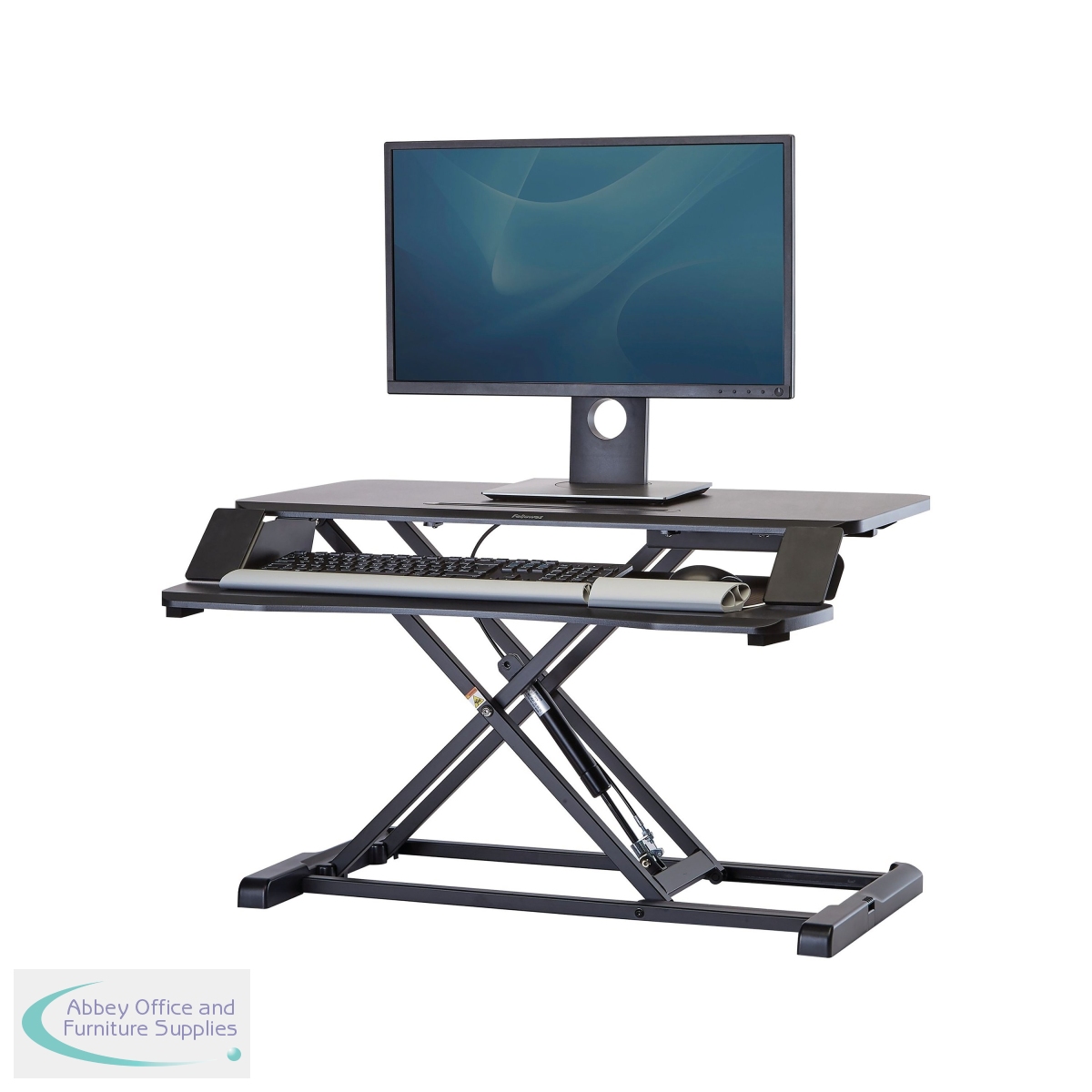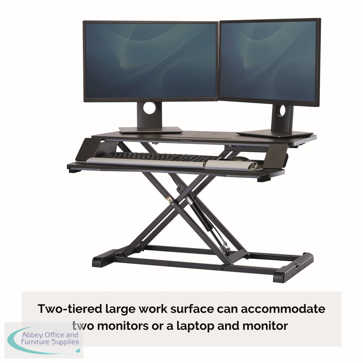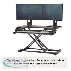 Fellowes Corsivo Sit-stand workstation is a cost-effective choice. Transform your sedentary desk into a dynamic sit-stand workstation and add movement to your working day to stay active and healthy. Easily transition from sitting to standing with gas spring height adjustment. Two-tiered larger work surface can accommodate flexible set up options, holding two monitors or a monitor and a laptop. Keep your phone or other accessories within easy reach with the convenient device channel. Black finish. Key Features