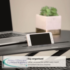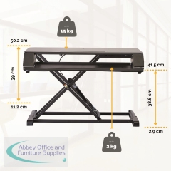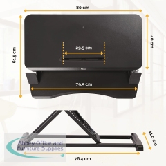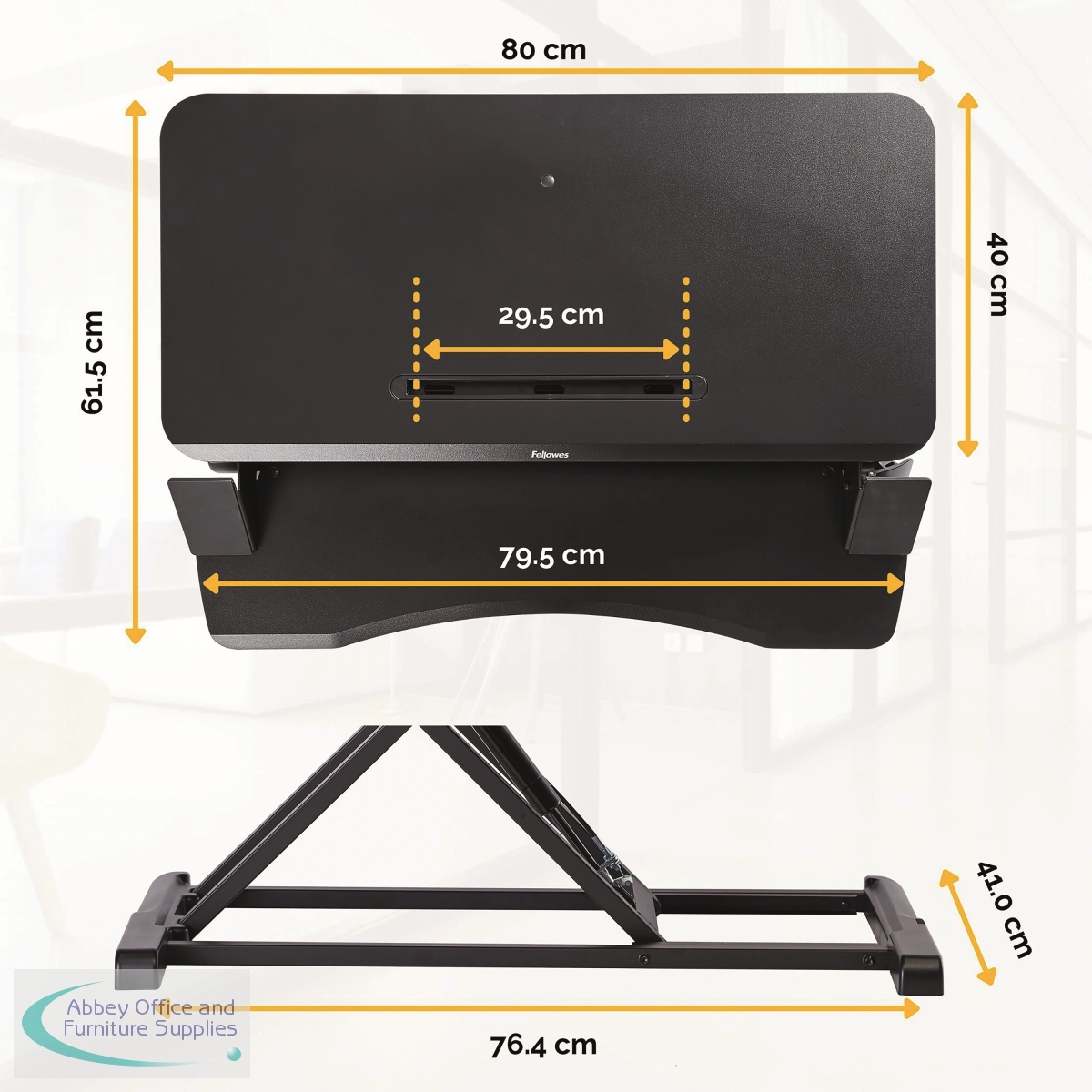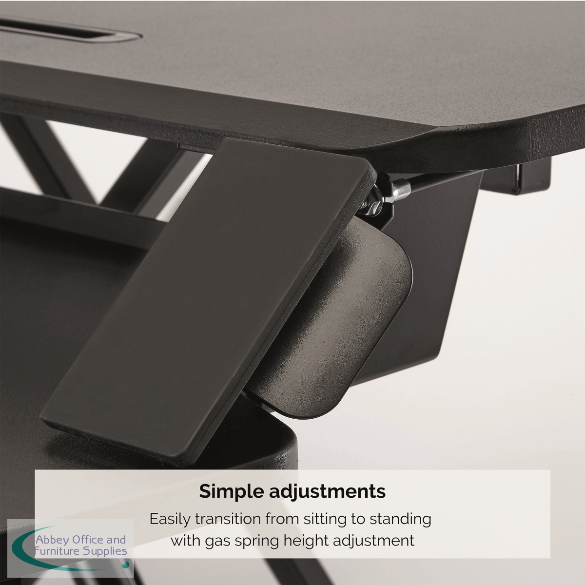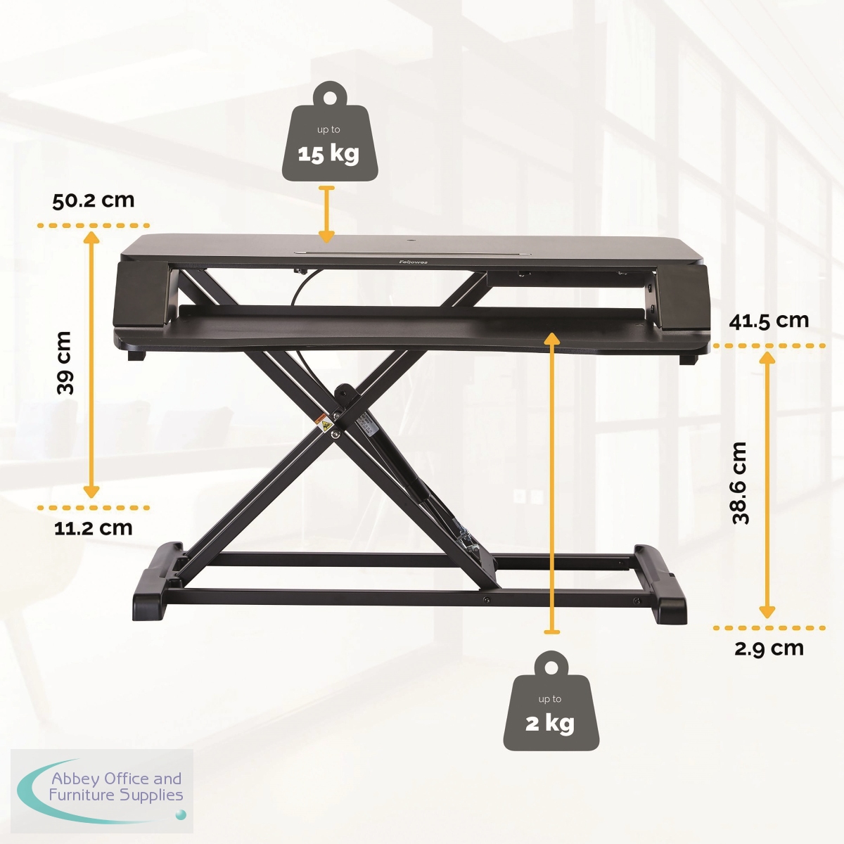 Fellowes Corsivo Sit-stand workstation is a cost-effective choice. Transform your sedentary desk into a dynamic sit-stand workstation and add movement to your working day to stay active and healthy. Easily transition from sitting to standing with gas spring height adjustment. Two-tiered larger work surface can accommodate flexible set up options, holding two monitors or a monitor and a laptop. Keep your phone or other accessories within easy reach with the convenient device channel. Black finish. Key Features