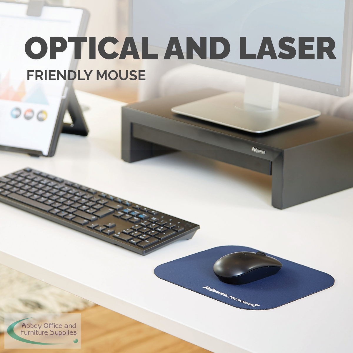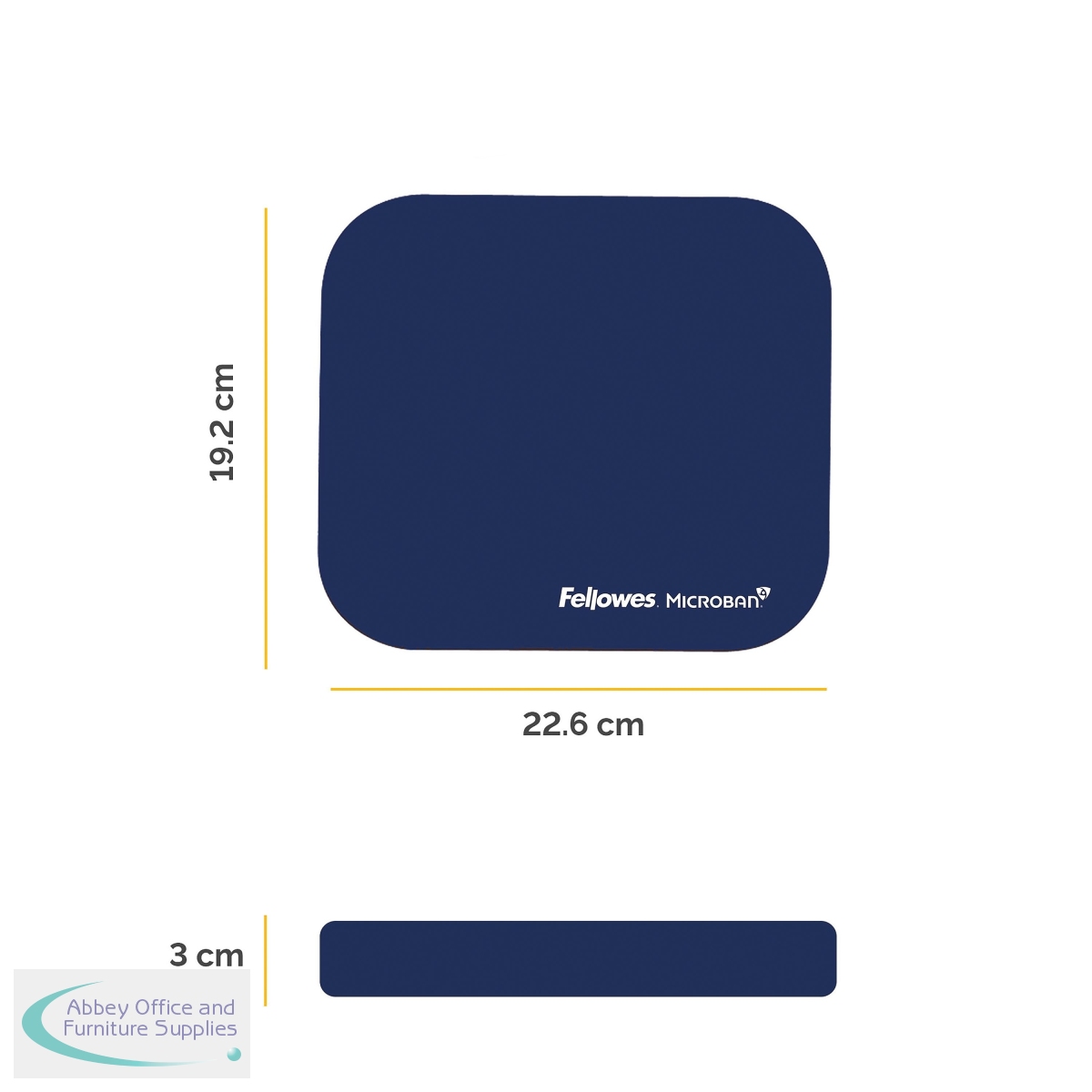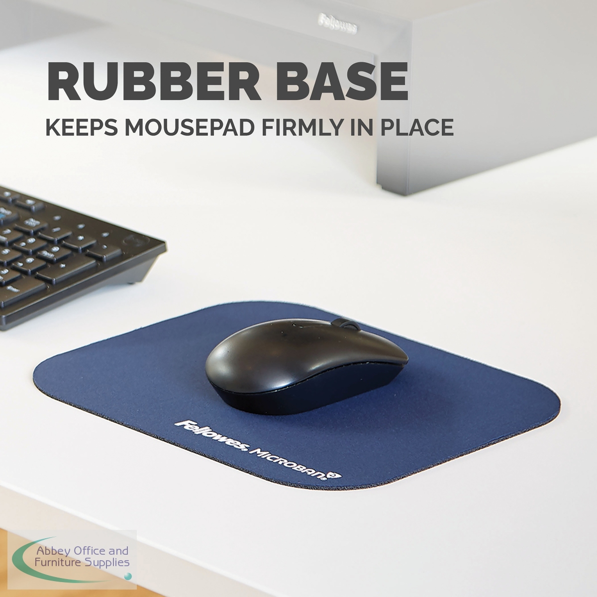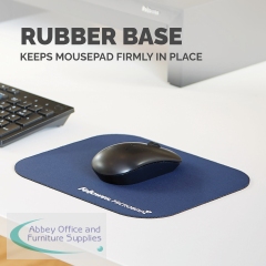 Fellowes mouse pad with Microban protection for a cleaner healthier office. Built in Microban protection fights the growth of harmful bacteria for the lifetime of the product. Active hygiene, helps keep your office equipment cleaner and healthier. Suitable for Optical and Laser Mice. Non-slip rubber base. A single mouse pad in navy.