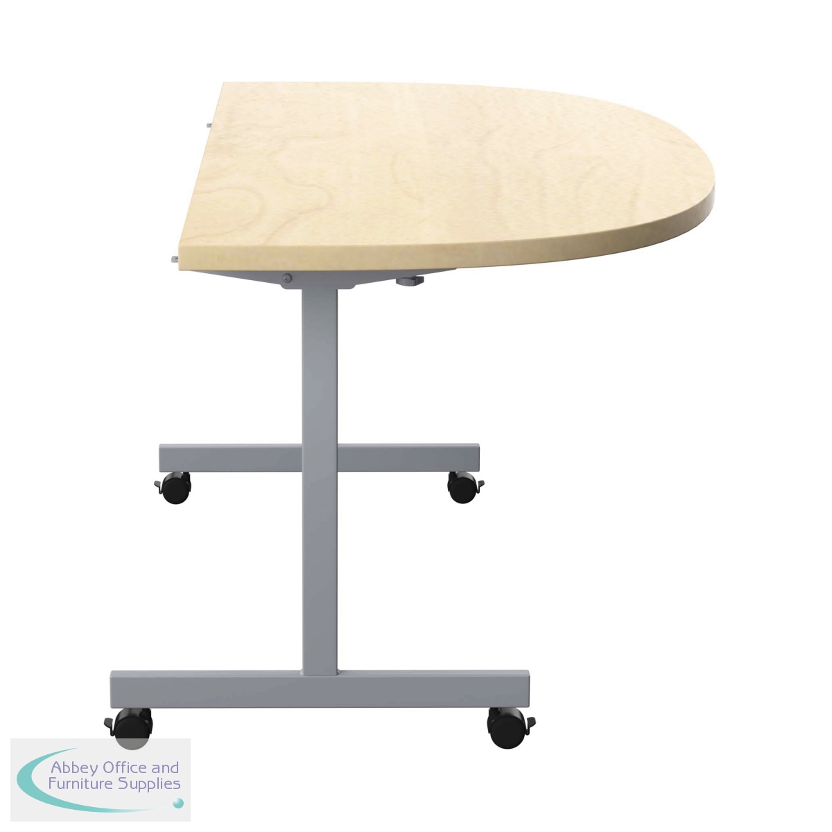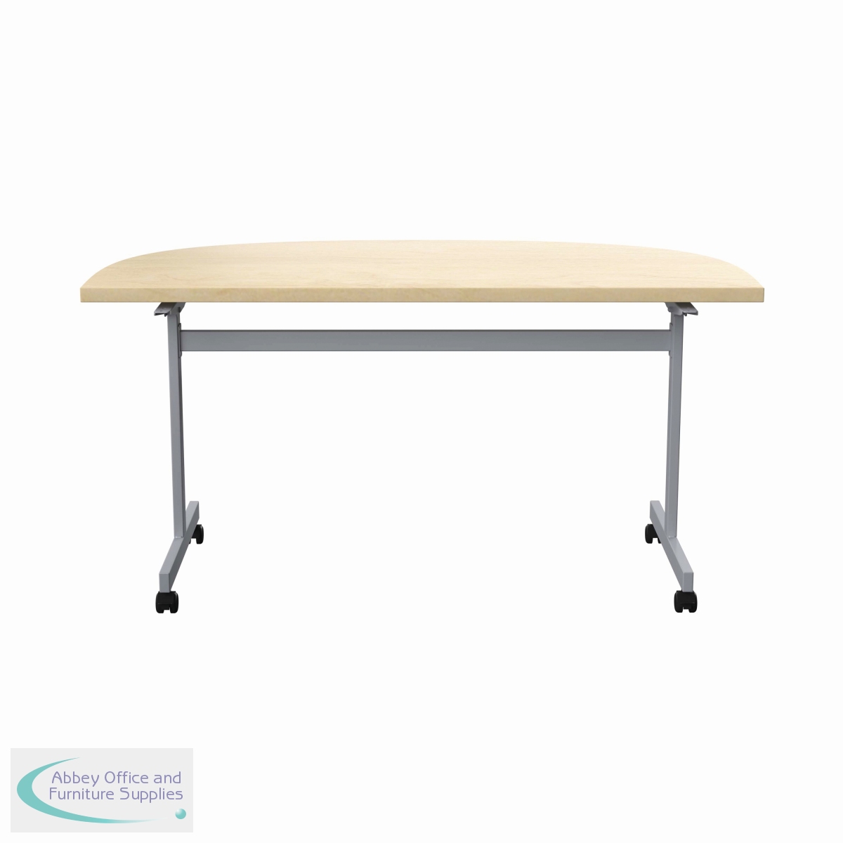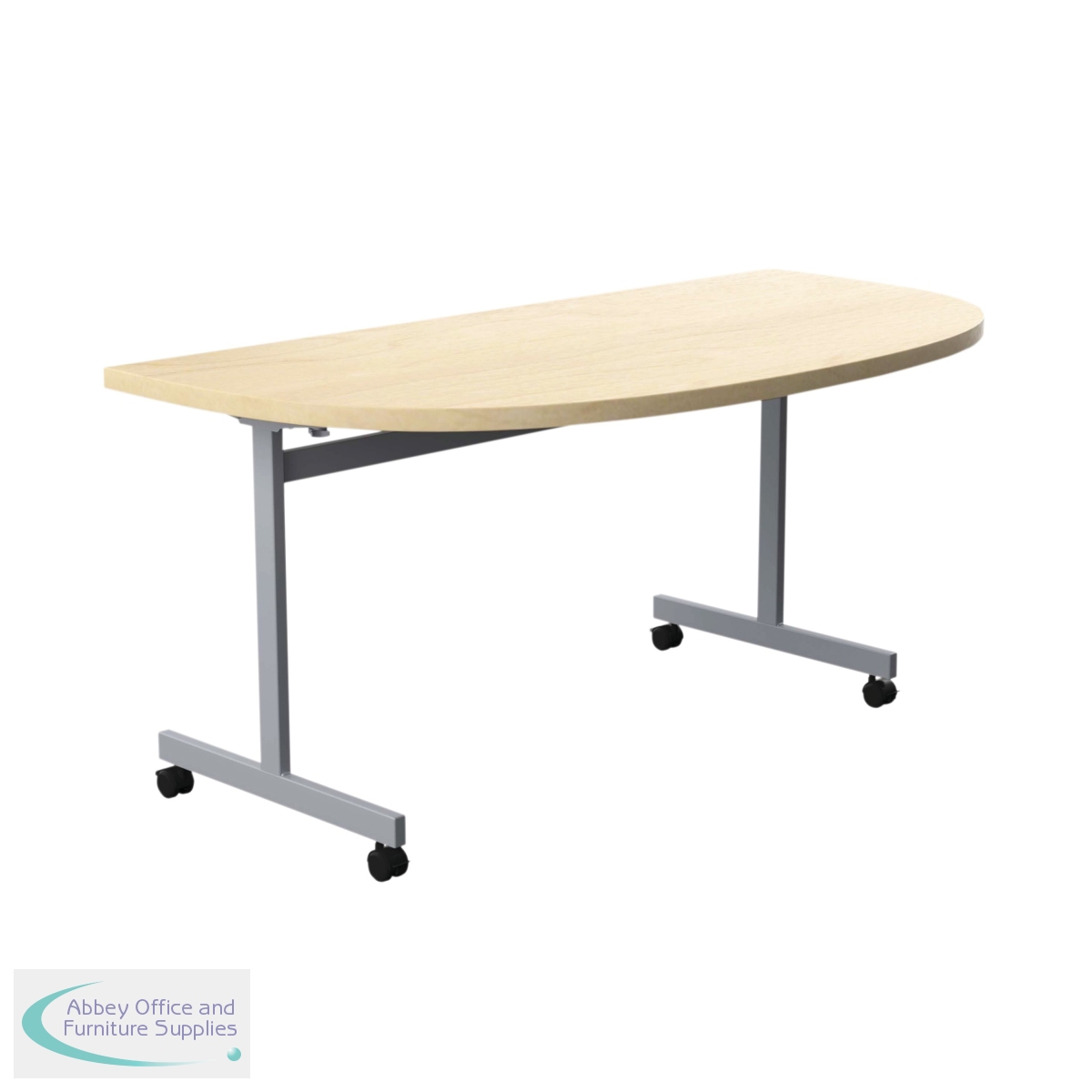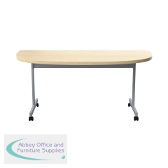 This economical mobile flip-top table has a hard-wearing MFC top and silver legs with black castors. The table nests for easy storage when not in use.
